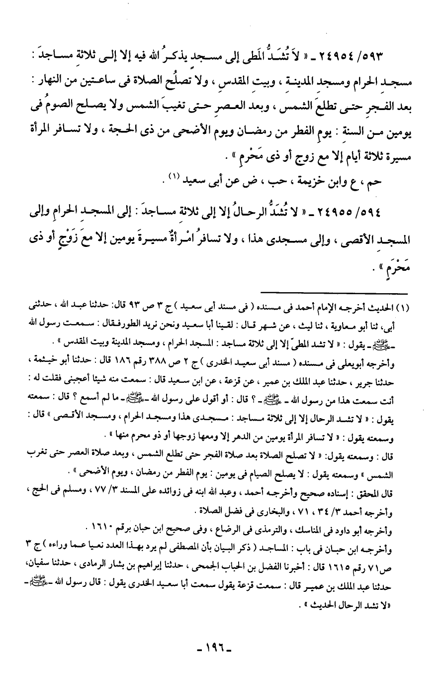 594/ 24955 - "لا تُشَدُّ الرحالُ إلا إلى ثلاثةِ مساجدَ: إلى المسجدِ الحرامِ وإلى المسجدِ الأقصى، وإلى مسجدى هذا، ولا تسافرُ امْرأةٌ مسيرةَ يومين إلا معَ زَوجٍ أو ذي مَحْرَمٍ".