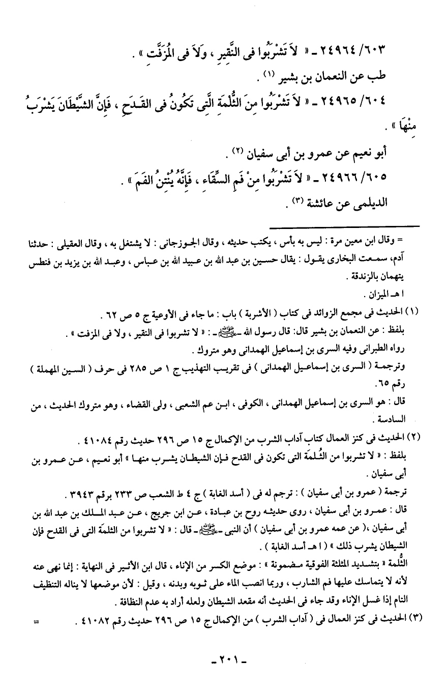 604/ 24965 - "لَا تَشْرَبُوا مِنَ الثُّلْمَةِ الَّتِي تكُونُ في القَدحَ، فَإِنَّ الشَّيطَانَ يَشْرَبُ مِنْهَا".