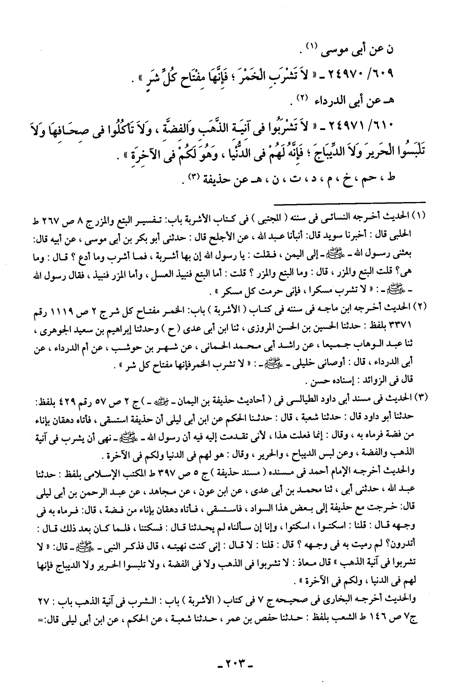 (¬3) الحديث في مسند أبي داود الطيالسي في (أحاديث حذيفة بن اليمان - رضي الله عنه -) ج 2 ص 57 رقم 429 بلفظ: حدثنا أبو داود قال: حدثنا شعبة، قال: حدثنا الحكم عن ابن أبي ليلى أن حذيفة أستسقى، فأتاه دهقان بإناء من فضة فرماه به، وقال: إنما فعلت هذا، لأنى تقدمت إليه فيه أن رسول الله - صلى الله عليه وسلم - نهى أن يشرب في آنية الذهب والفضة، وعن لبس الديباح، والحرير، وقال: هو لهم في الدنيا ولكم في الآخرة.