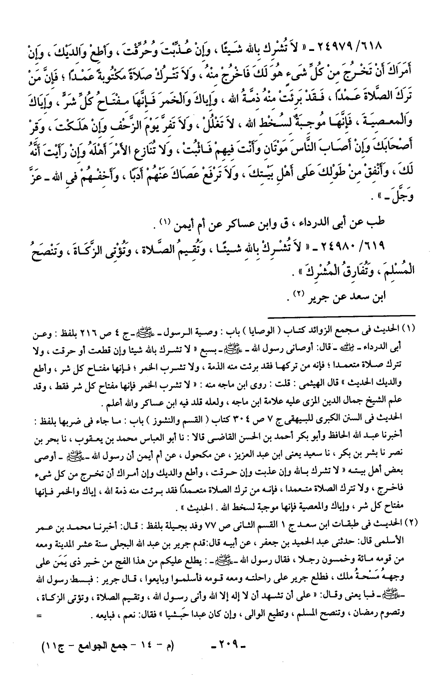 619/ 24980 - "لَا تُشْرِكْ بالله شيئًا، وَتُقِيمُ الصَّلاة، وَتُؤْتِي الزَّكَاةَ، وَتنْصَحُ الْمُسْلِمَ، وَتُفَارِقُ الْمُشْرِكَ".