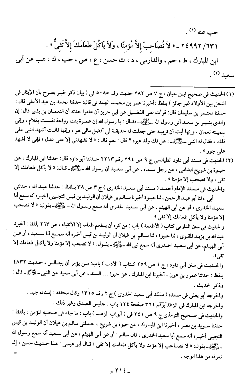 (¬2) الحديث في مسند أبي داود الطيالسي ج 9 ص 294 رقم 2213 حدثنا أبو داود قال: حدثنا ابن المبارك، عن حيوة بن شريح الشامي، عن رجل سماه، عن أبي سعيد أن رسول الله - صلى الله عليه وسلم - قال: "لا يأكل طعامك إلا تقى، ولا تصحب إلا مؤمنا".