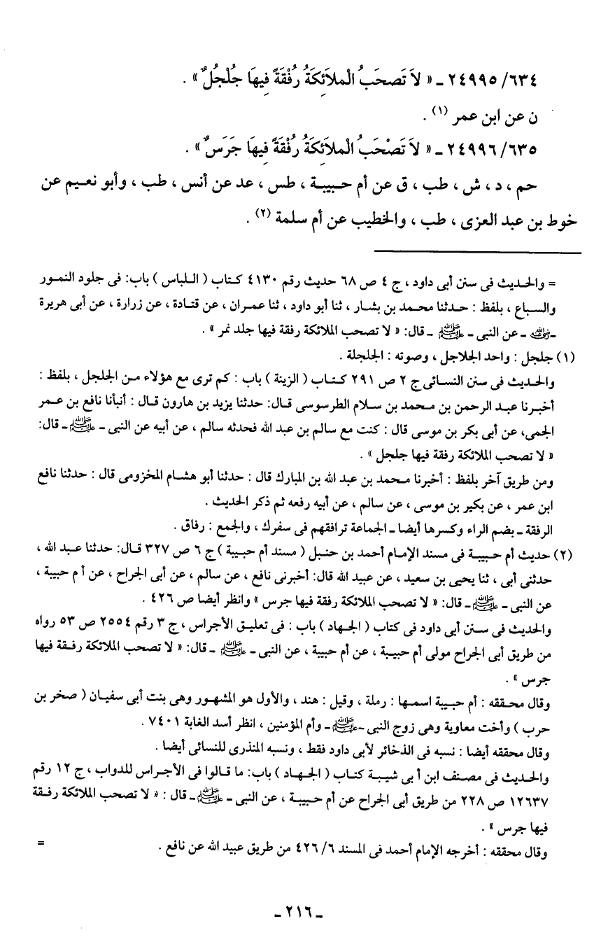 (¬2) حديث أم حبيبة في مسند الإمام أحمد بن حنبل (مسند أم حبيبة) ج 6 ص 327 قال: حدثنا عبد الله، حدثني أبي، ثنا يحيى بن سيد، عن عبيد الله قال: أخبرني نافع، عن سالم، عن أبي الجراح، عن أم حبيبة، عن النبي - صلى الله عليه وسلم - قال: "لا تصحب الملائكة رفقة فيها جرس" وانظر أيضًا ص 426.