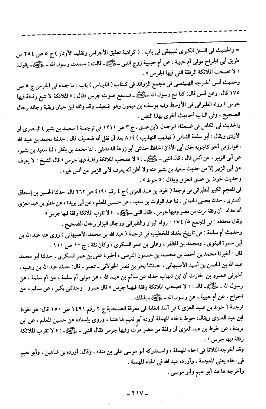 = والحديث في السنن الكبرى للبيهقي في باب: (كراهية تعليق الأجراس وتقليد الأوتار) ج 5 ص 254 من طريق أبي الجراح مولى أم حبيبة، عن أبي حبيبة زوج النبي - صلى الله عليه وسلم - قالت: سمعت رسول الله - صلى الله عليه وسلم - يقول: "لا تصحب الملائكة الرفقة التي فيها الجرس".