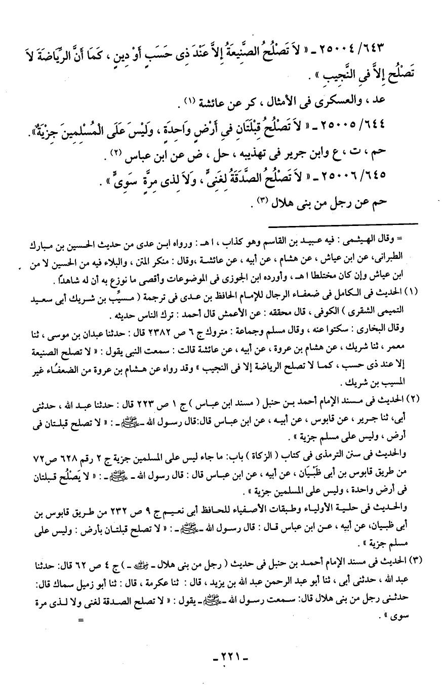 644/ 25005 - "لَا تَصْلُحُ قِبْلَتَانِ فِي أَرْضٍ وَاحِدَةٍ، وَليسَ عَلَى الْمُسْلِمِينَ جِزْيَةٌ".