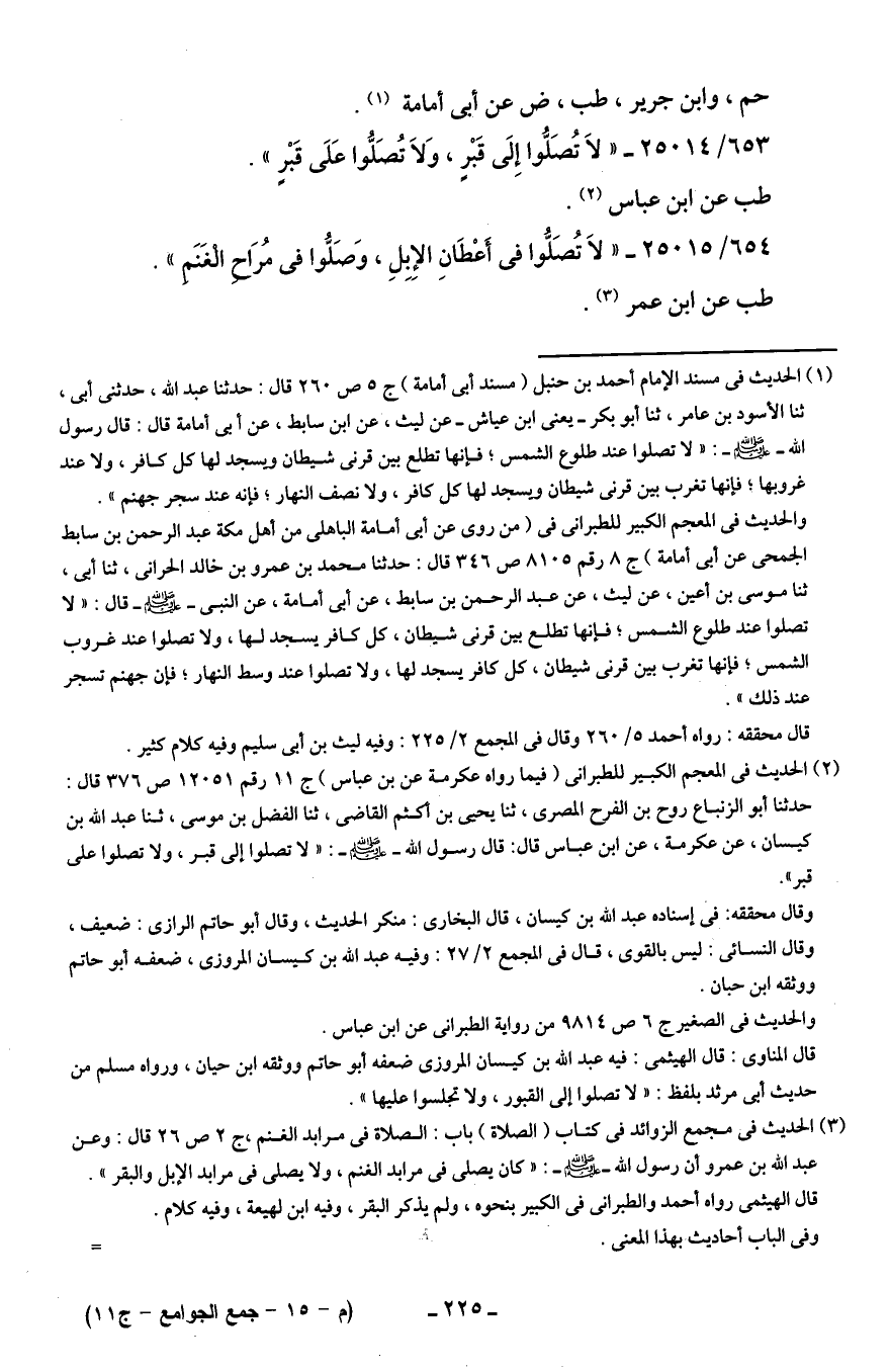 (¬2) الحديث في المعجم الكبير للطبراني (فيما رواه عكرمة عن بن عباس) ج 11 رقم 12051 ص 376 قال: حدثنا أبو الزنباع روح بن الفرح المصري، ثنا يحيى بن أكثم القاضي، ثنا الفضل بن موسى، ثنا عبد الله بن كيسان، عن عكرمة، عن ابن عباس قال: قال رسول الله - صلى الله عليه وسلم -: "لا تصلوا إلى قبر، ولا تصلوا على قبر".