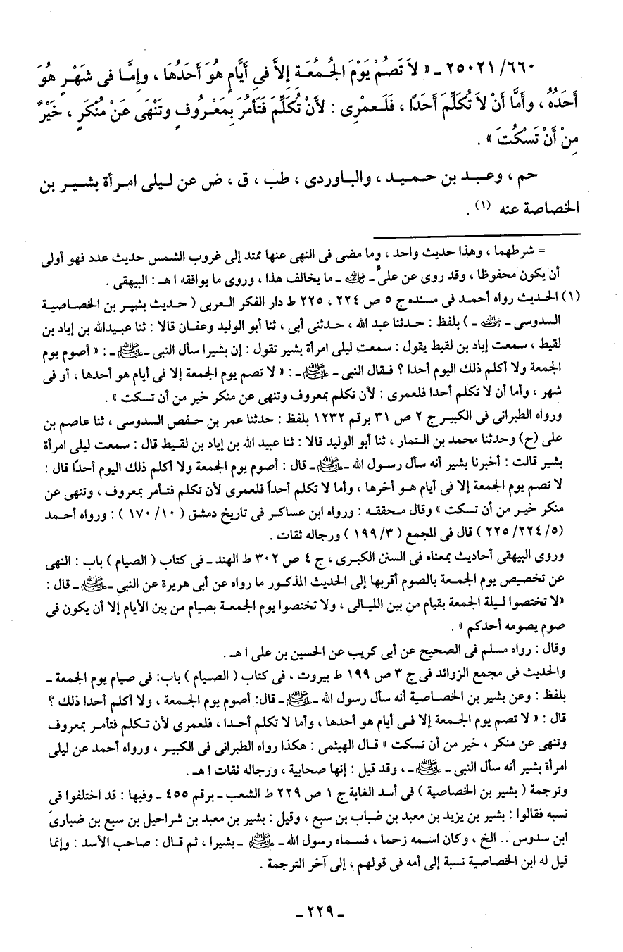 ورواه الطبراني في الكبير ج 2 ص 31 برقم 1232 بلفظ: حدثنا عمر بن حفص السدوسى، ثنا عاصم بن على (ح) وحدثنا محمد بن النمار، ثنا أبو الوليد قالا: ثنا عبيد الله بن إياد بن لقيط قال: سمعت ليلى امرأة بشير قالت: أخبرنا بشير أنه سأل رسول الله - صلى الله عليه وسلم - قال: أصوم يوم الجمعة ولا أكلم ذلك اليوم أحدًا قال: لا تصم يوم الجمعة إلا في أيام هو أخرها، وأما لا تكلم أحدًا فلعمرى لأن تكلم فتأمر بمعروف، وتنهى عن منكر خير من أن تسكت" وقال محققه: ورواه ابن عساكر في تاريخ دمشق (10/ 170): ورواه أحمد (5/ 224 / 225) قال في المجمع (3/ 199) ورجاله ثقات.