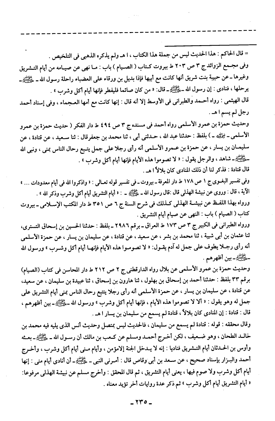 وحديث حمزة بن عمرو الأسلمي عن بلال رواه الدارقطني ج 2 ص 212 ط دار المحاسن في كتاب (الصيام) برقم 33 بلفظ: حدثنا أحمد بن إسحاق بن بهلول، ثنا هارون بن إسحاق، ثنا عبيدة بن سليمان، عن سعيد، عن قتادة، عن سليمان بن يسار، عن حمزة الأسلمي أنه رأى رجلا يتتبع رحال الناس بمنى أيام التشريق على جمل له وهو يقول: "ألا لا تصوموا هذه الأيام، فإنها أيام أكل وشرب" ورسول الله - صلى الله عليه وسلم - بين أظهرهم، قال: قتادة: إن المنادى كان بلالًا، قتادة لم يسمع من سليمان بن يسار اهـ.