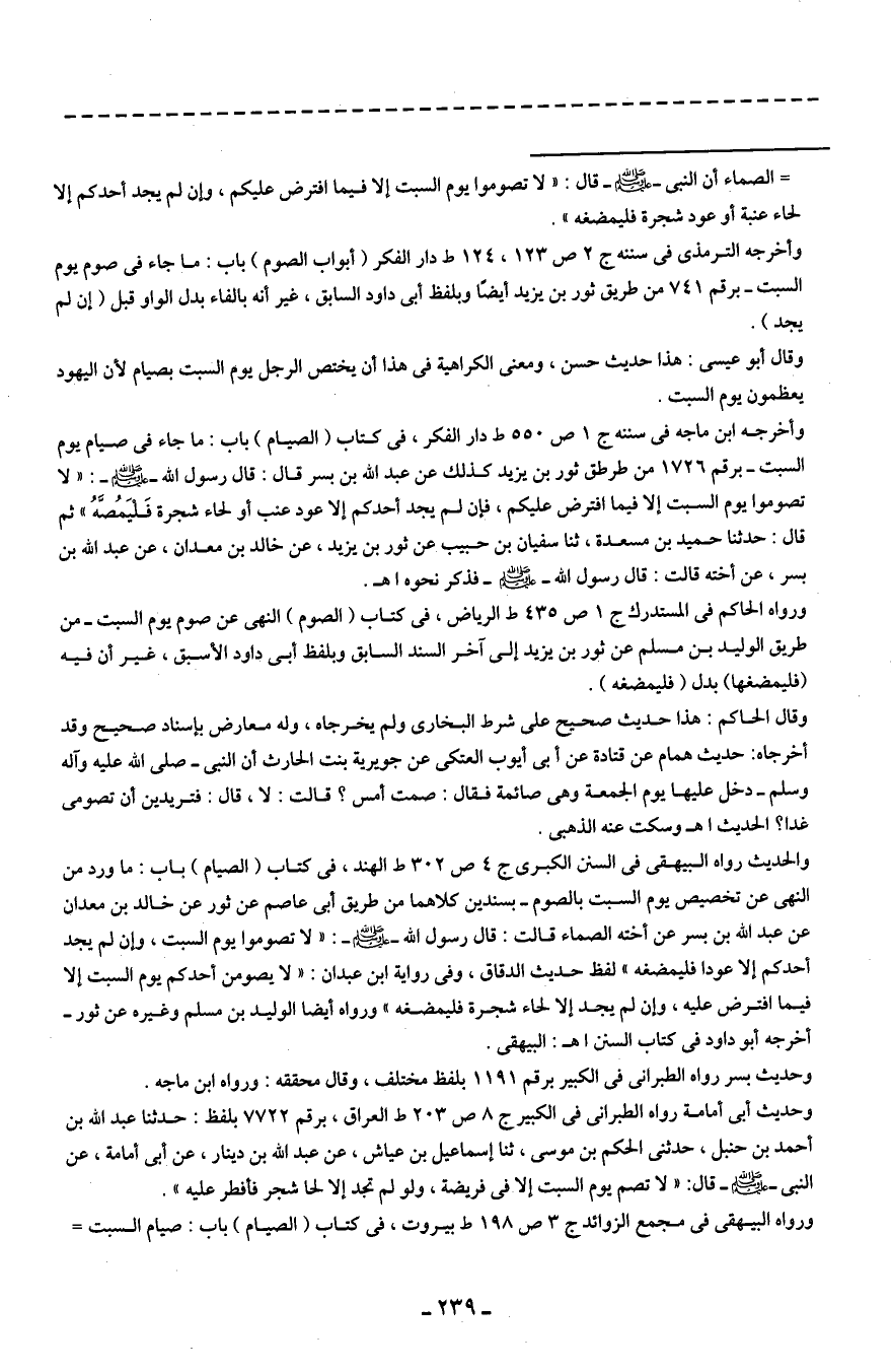 والحديث رواه البيهقي في السنن الكبرى ج 4 ص 302 ط الهند، في كتاب (الصيام) باب: ما ورد من النهي عن تخصيص يوم السبت بالصوم - بسندين كلاهما من طريق أبي عاصم عن ثور عن خالد بن معدان عن عبد الله بن بسر عن أخته الصماء قالت: قال رسول الله - صلى الله عليه وسلم -: "لا تصوموا يوم السبت، وإن لم يجد أحدكم إلا عودا فليمضغه" لفظ حديث الدقاق، وفي رواية ابن عبدان: "لا يصومن أحدكم يوم السبت إلا فيما افترض عليه، وإن لم يجد إلا لحاء شجرة فليمضغه" ورواه أيضًا الوليد بن مسلم وغيره عن ثور - أخرجه أبو داود في كتاب السنن اهـ: البيهقي.