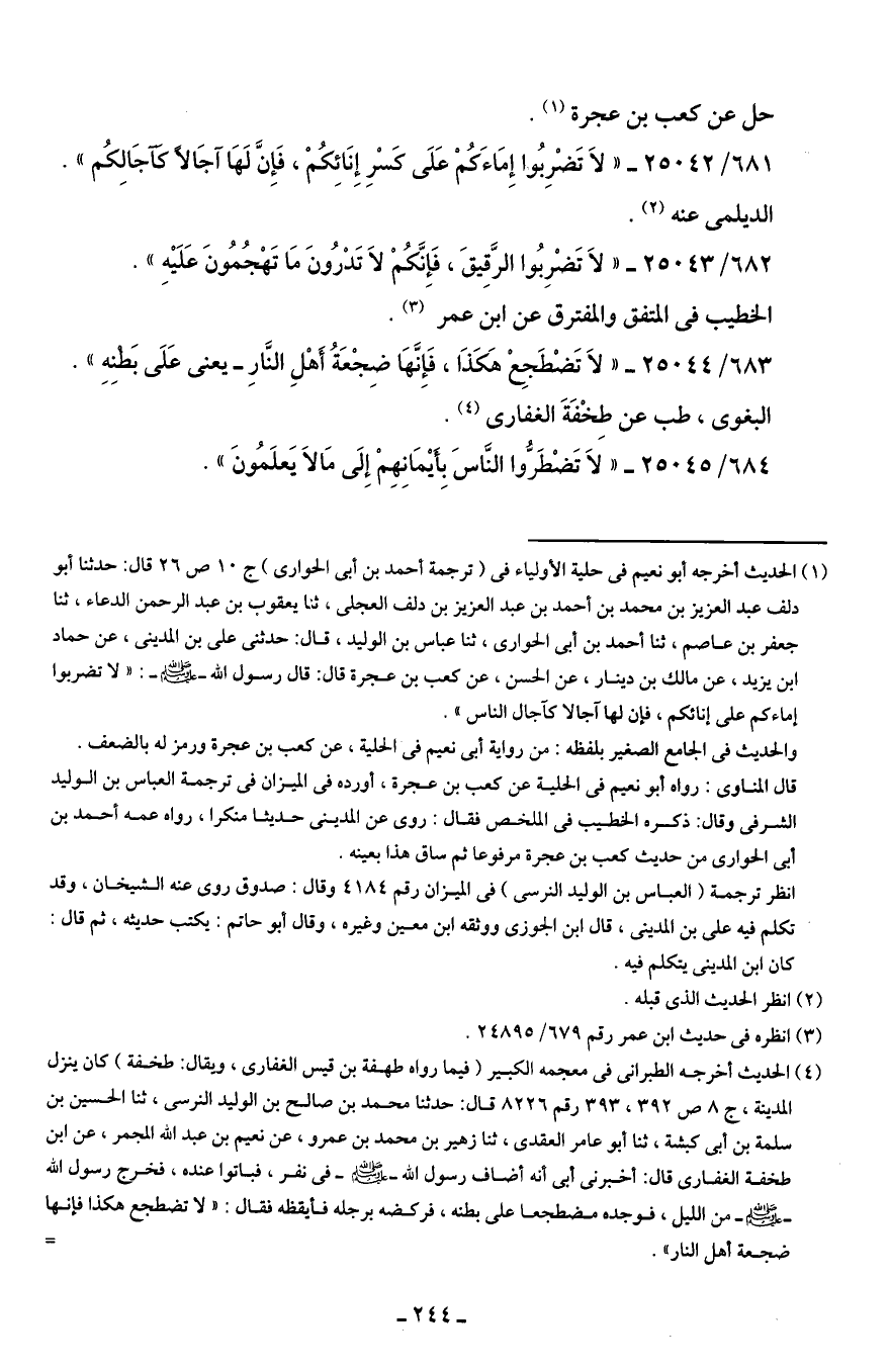 (¬1) الحديث أخرجه أبو نعيم في حلية الأولياء في (ترجمة أحمد بن أبي الحوارى) ج 10 ص 26 قال: حدثنا أبو دلف عبد العزيز بن محمد بن أحمد بن عبد العزيز بن دلف العجلي، ثنا يعقوب بن عبد الرحمن الدعاء، ثنا جعفر بن عاصم، ثنا أحمد بن أبي الحوارى، ثنا عباس بن الوليد، قال: حدثني علي بن المديني، عن حماد بن يزيد، عن مالك بن دينار، عن الحسن، عن كعب بن عجرة قال: قال رسول الله - صلى الله عليه وسلم -: "لا تضربوا إماءكم على إنائكم، فإن لها آجالا كآجال الناس".