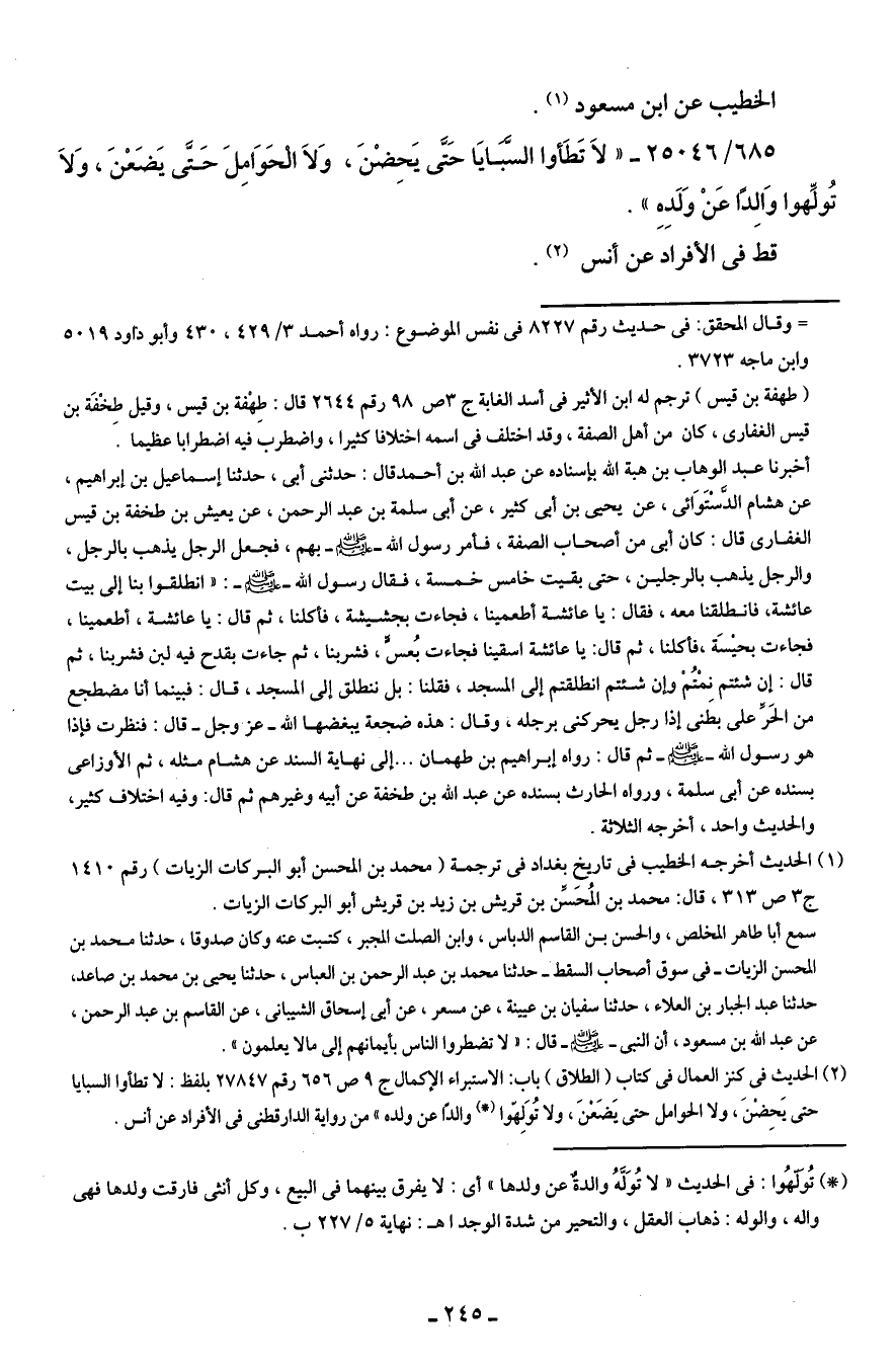 685/ 25046 - "لَا تَطَأوا السَّبَايَا حَتَّى يَحِضْنَ، وَلَا الْحَوَامِلَ حَتَّى يَضَعْنَ، وَلَا تُولِّهوا وَالِدًا عَنْ وَلَدِهِ".