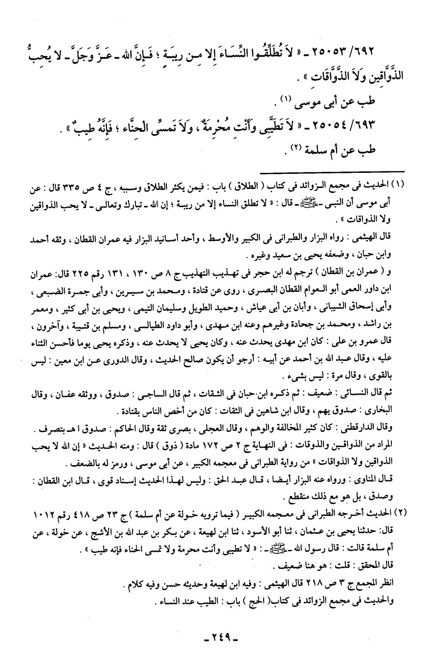 692/ 25053 - "لَا تُطَلِّقُوا النِّسَاءَ إِلا مِن رِيبَةٍ؛ فَإِنَّ الله -عَزَّ وَجَلَّ- لا يُحِبُّ الذَّوَّاقِين وَلَا الذَّوَّاقَاتِ".
