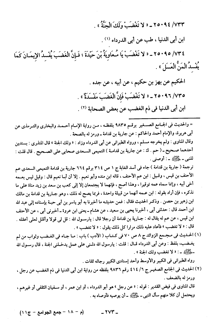 734/ 25095 - "لا تَغْضَبْ يَا مُعَاويَةُ بْنَ حَيدَةَ؛ فَإِنَّ الْغَضَبَ يُفْسِدُ الإِيمَانَ كَمَا يُفْسِدُ الْمَنُّ الْعَسَلَ".