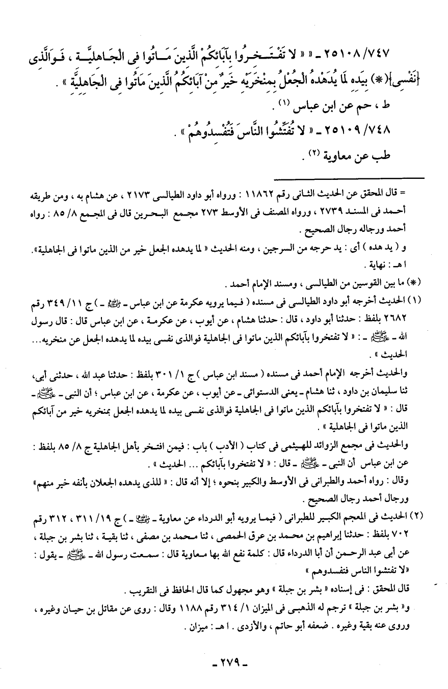 (¬1) الحديث أخرجه أبو داود الطيالسي في مسنده (فيما يرويه عكرمة عن ابن عباس - رضي الله عنهم -) ج 11/ 349 رقم 2682 بلفظ: حدثنا أبو داود، قال: حدثنا هشام، عن أيوب، عن عكرمة، عن ابن عباس قال: قال رسول الله - صلى الله عليه وسلم -: "لا تفتخروا بآبائكم الذين ماتوا في الجاهلية فوالذي نفسي بيده لما يدهده الجعل عن منخريه ... الحديث".