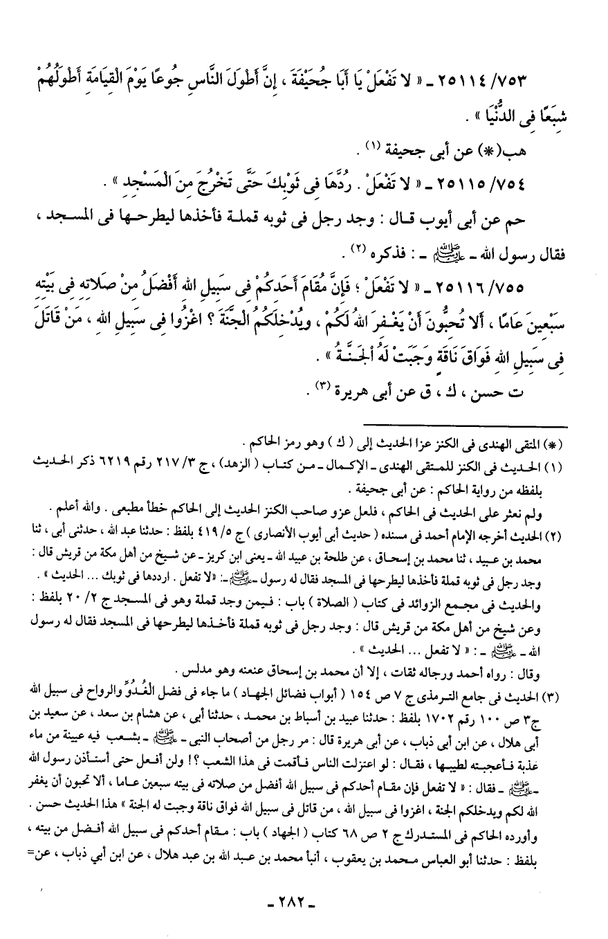 753/ 25114 - "لا تَفْعَلْ يَا أَبَا جُحَيفَةَ، إِنَّ أطوَلَ النَّاسِ جُوعًا يَوْمَ الْقِيَامَةِ أَطوَلُهُمْ شِبَعًا فِي الدُّنْيَا".