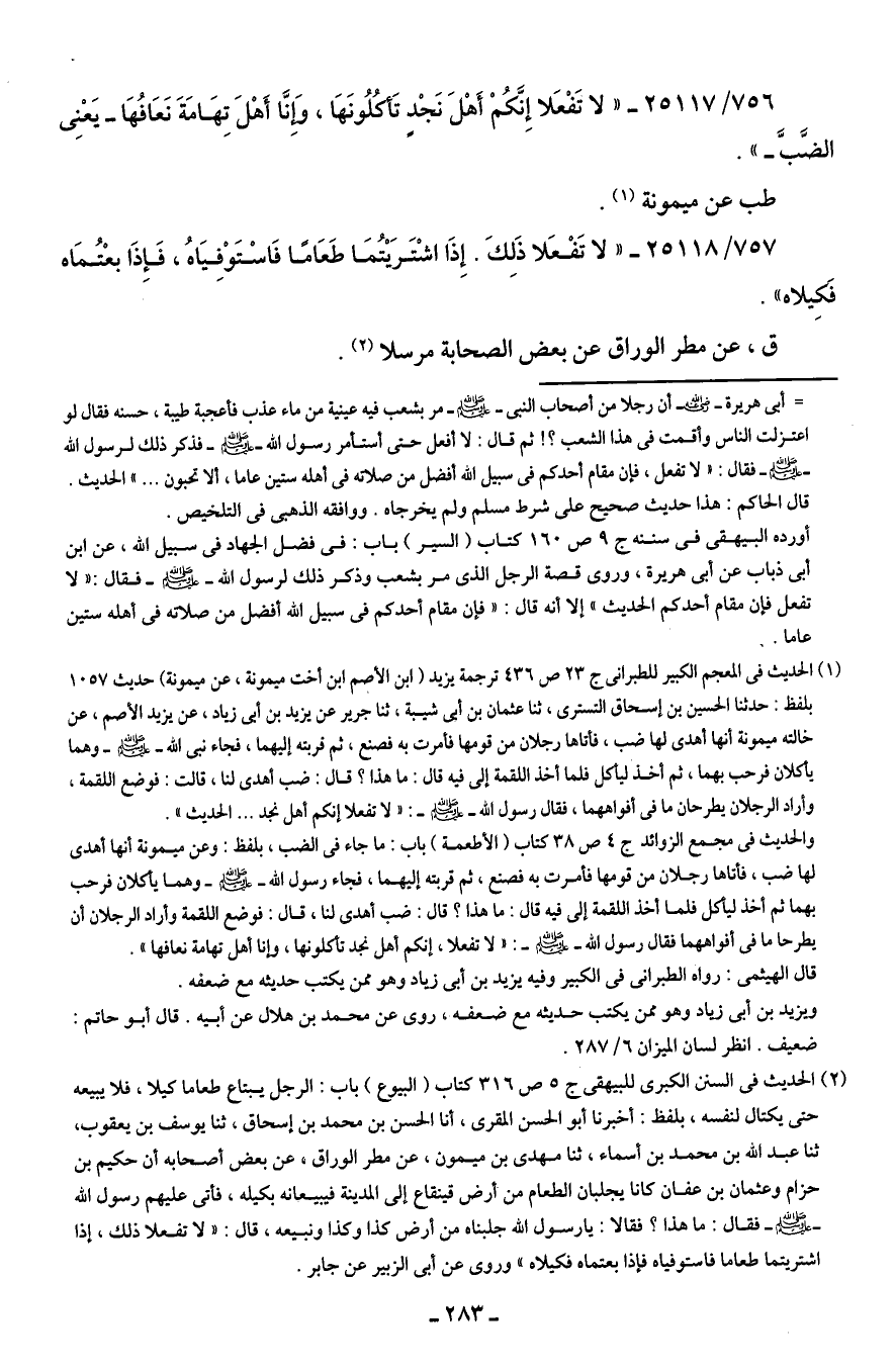 756/ 25117 - "لا تَفْعَلا إِنَّكُمْ أَهْلَ نَجْدٍ تَأكُلُونَهَا، وَإنَّا أَهْلَ تِهَامَةَ نَعَافُهَا -يَعْنِي الضَّبَّ-".
