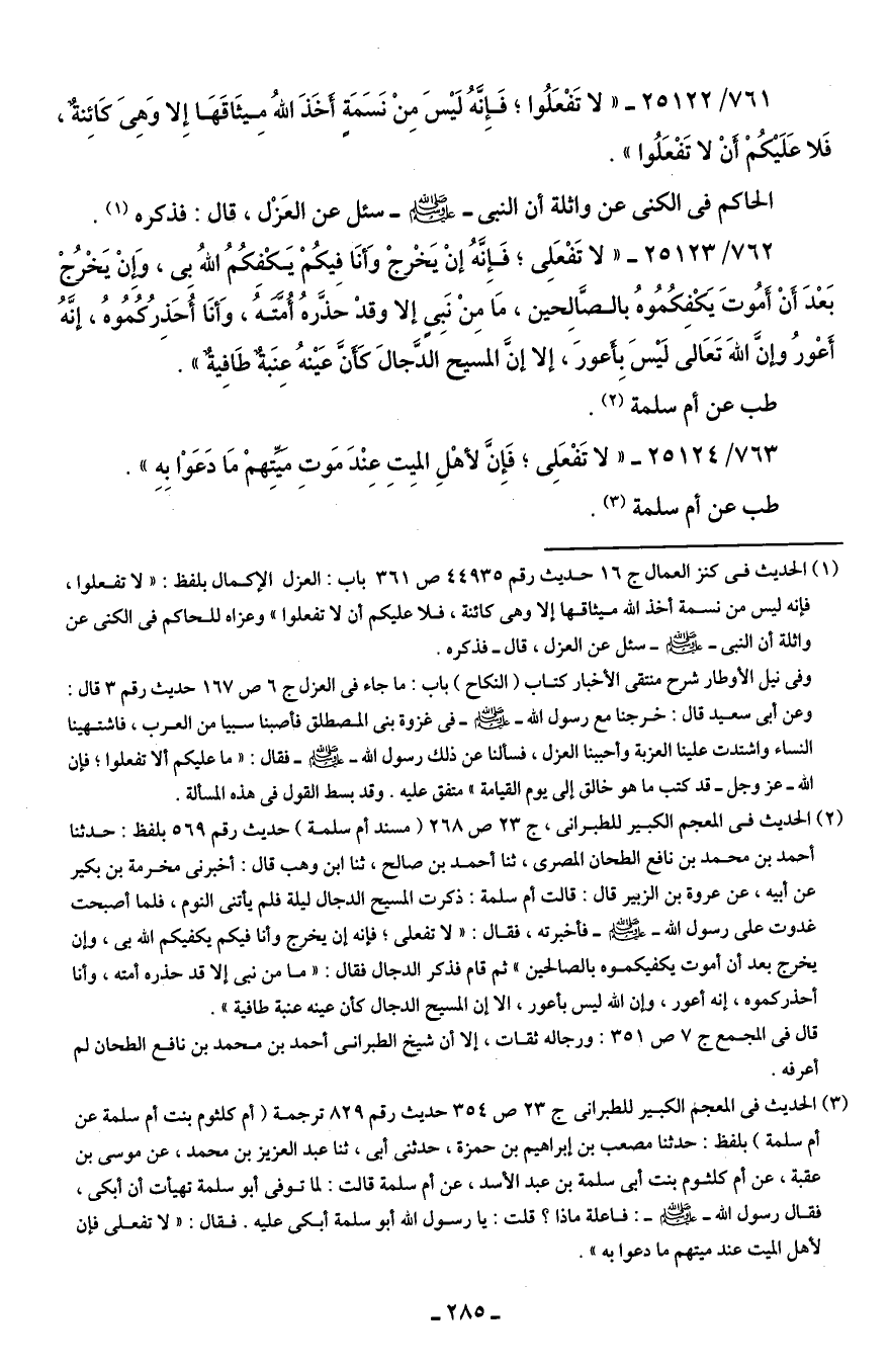 761/ 25122 - "لا تَفْعَلُوا؛ فَإنَّهُ لَيسَ مِنْ نَسَمَةٍ أَخَذَ اللهُ ميثَاقَهَا إلا وَهِيَ كَائِنةٌ، فَلا عَلَيكُمْ أَنْ لا تَفْعَلُوا".