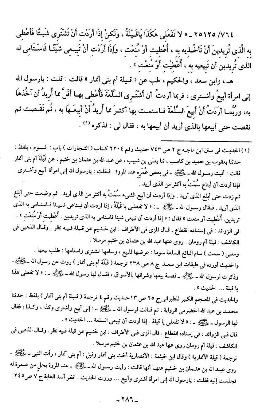 764/ 25125 - "لا تَفْعَلِي هَكَذَا يَا قَيْلَةُ، وَلَكِنْ إِذَا أَرَدْتِ أَنْ تَشْتَرِي شَيئًا فَأَعْطِي بِهِ الَّذِي تُرِيدِينَ أَنْ تَأخُذِيه بِهِ، أُعْطِيتِ أَوْ مُنِعْتِ، وَإذَا أَرَدْتِ أَنْ تَبِيعِي شَيئًا فَاسْتَامِي له الذي تُرِيدين أن تَبِيعيه بِهِ، أُعطِيتِ أَوْ مُنِعْتِ".