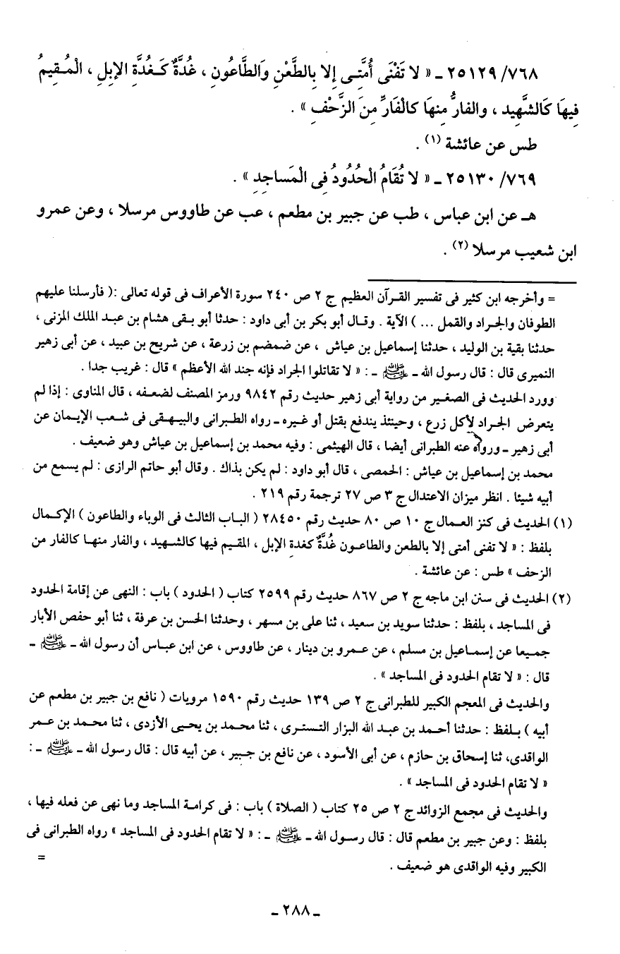 (¬2) الحديث في سنن ابن ماجه ج 2 ص 867 حديث رقم 2599 كتاب (الحدود) باب: النهي عن إقامة الحدود في المساجد، بلفظ: حدثنا سويد بن سعيد، ثنا علي بن مسهر، وحدثنا الحسن بن عرفة، ثنا أبو حفص الأبار جميعا عن إسماعيل بن مسلم، عن عمرو بن دينار، عن طاووس، عن ابن عباس أن رسول الله - صلى الله عليه وسلم - قال: "لا تقام الحدود في المساجد".