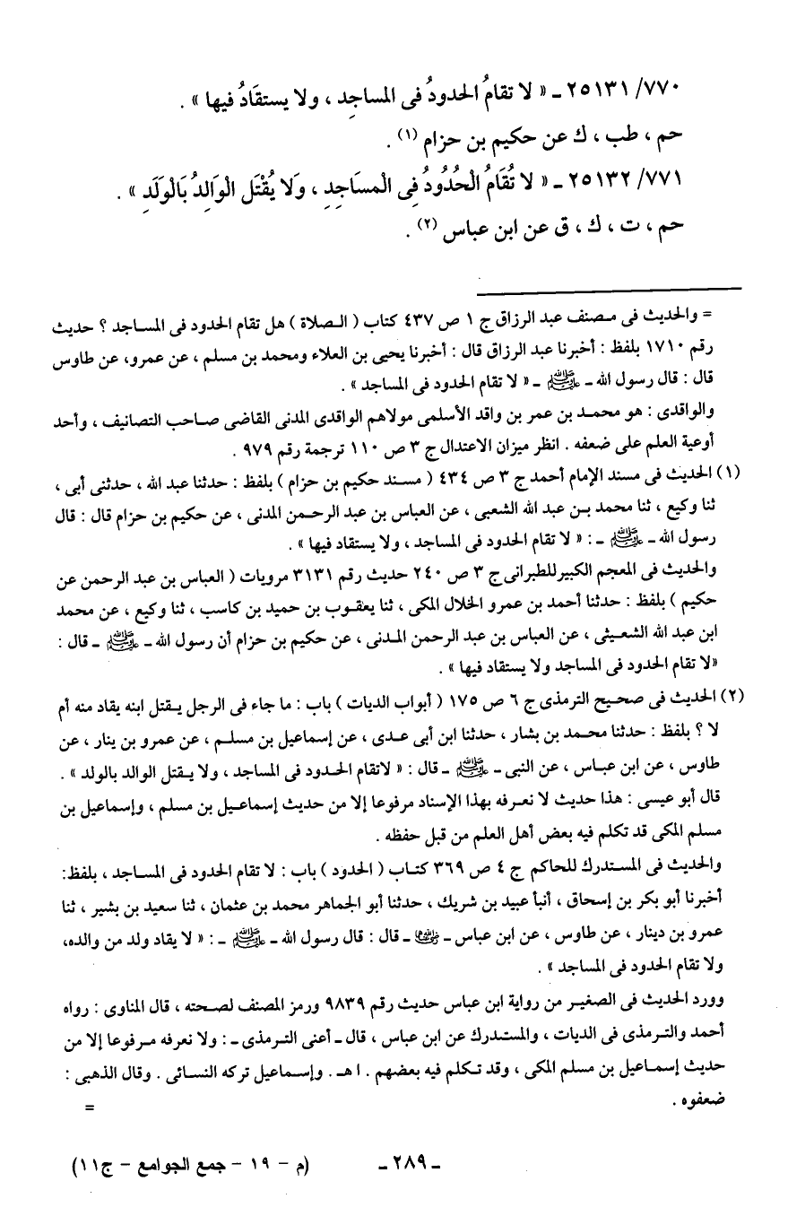 771/ 25132 - "لا تُقَامُ الْحُدُود فِي الْمسَاجِدِ، وَلا يُقْتَل الْوَالِدُ بَالْوَلَدِ".