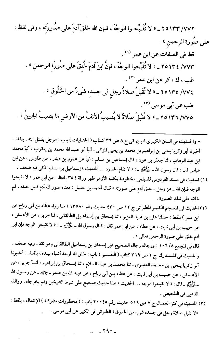 772/ 25133 - "لا تُقَبِّحوا الوجْهَ، فإن الله خلقَ آدمَ على صُورَتِه، وفي لفظ: على صُورة الرحمنِ".