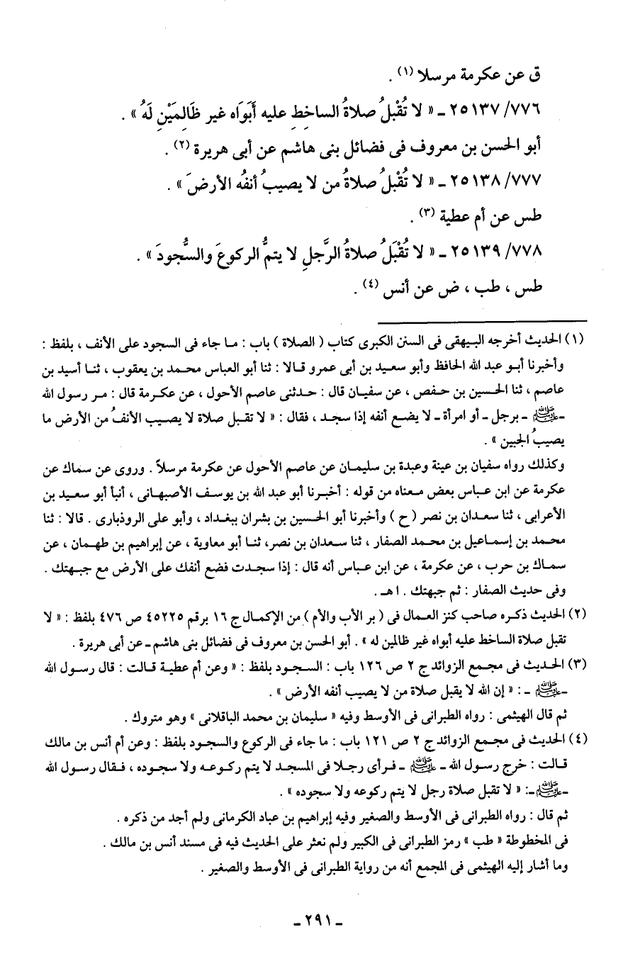 (¬3) الحديث في مجمع الزوائد ج 2 ص 126 باب: السجود بلفظ: "وعن أم عطية قالت: قال رسول الله - صلى الله عليه وسلم -: "إن الله لا يقبل صلاة من لا يصيب أنفه الأرض".