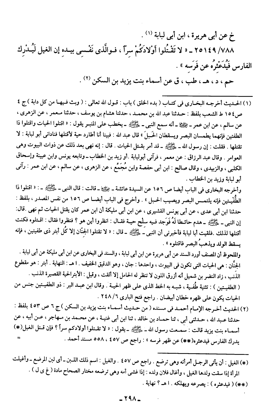 وأخرجه البخارى في الباب أيضًا ص 156 عن السيدة عائشة - رضي الله عنهما - قالت: قال النبي - صلى الله عليه وسلم -: "اقتلوا ذا الطُّفْيتين فإنه يلتمس البصر ويصيب الحبل". وأخرج في الباب أيضًا ص 156 من نفس المصدر، بلفظ: حدثنا ابن أبى عدى، عن أبى يونس القشيرى، عن ابن أبى مليكة أن ابن عمر كان يقتل الحيات ثم نهى. قال: إن النبي - صلى الله عليه وسلم - هدم حائطا لَهُ فَوَجد فيه سِلْح حية فقال: انظروا أين هو؟ فنظروا فقال: اقتلوه فكنت أقتلها لذلك. فلقيت أبا لبابة فأخبرنى أن النبي - صلى الله عليه وسلم - قال: "لا تقتلوا الجِنّان إلا كُل أبتر ذى طفيتين، فإنه يسقط الولد ويذهبُ البصر فاقتلوه".