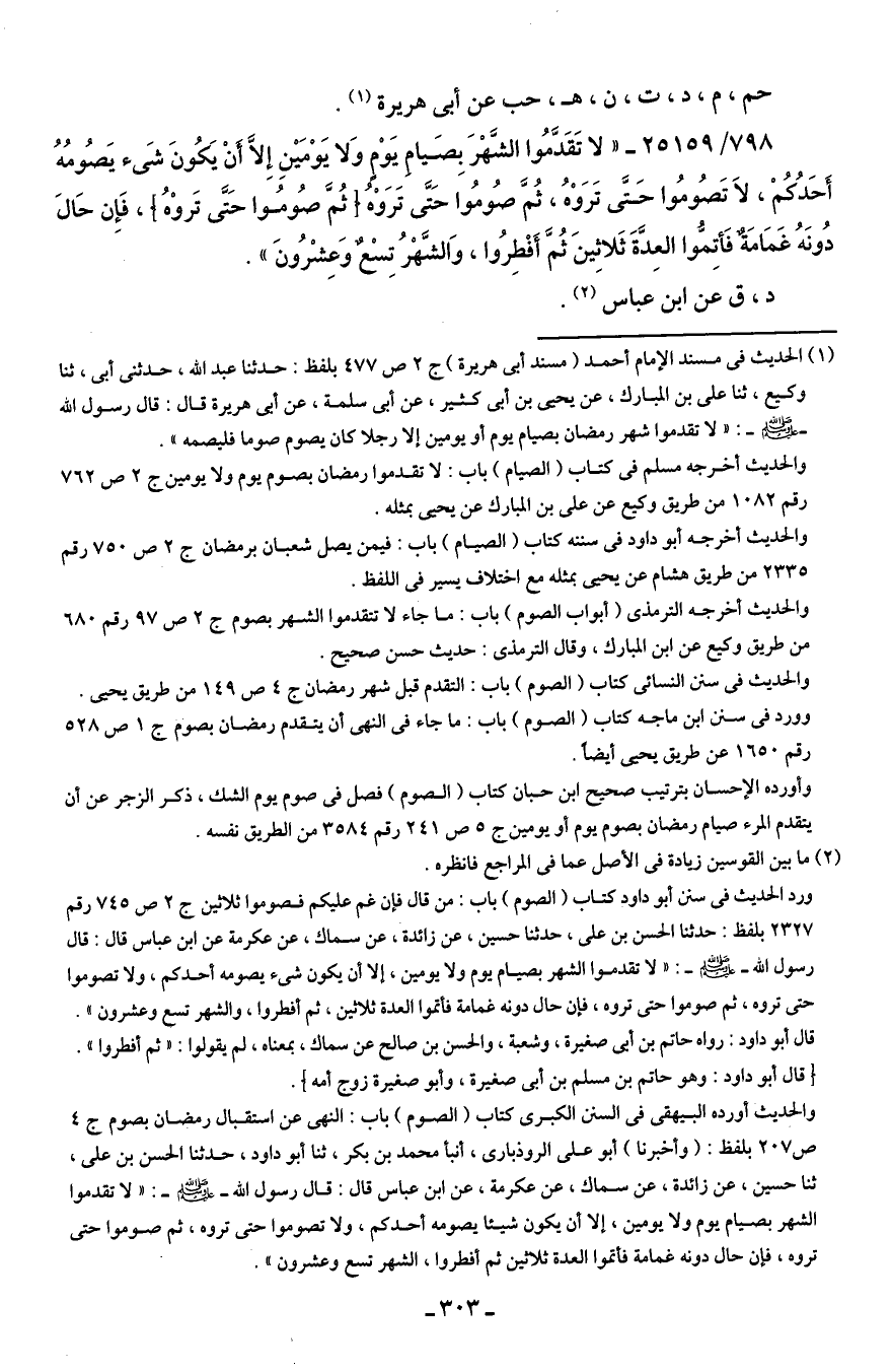798/ 25159 - "لا تَقَدَّمُوا الشَّهْرَ بِصَيامِ يَوْمٍ وَلا يَوْمَيْنِ إِلاَّ أَنْ يَكُونَ شَئ يَصُومُهُ أَحَدُكُمْ، لاَ تَصُومُوا حَتَّى تَرَوْهُ، ثُمَّ صُومُوا حَتَّى تَرَوْهُ {ثُمَّ صُومُوا حَتَّى تَروْهُ}، فَإِن حَالَ دُونَهُ غَمَامَةٌ فَأتِمُّوا العِدَّةَ ثَلاثِينَ ثُمَّ أَفْطِرُوا، وَالشَّهْرُ تِسْعٌ وَعِشْرُونَ".