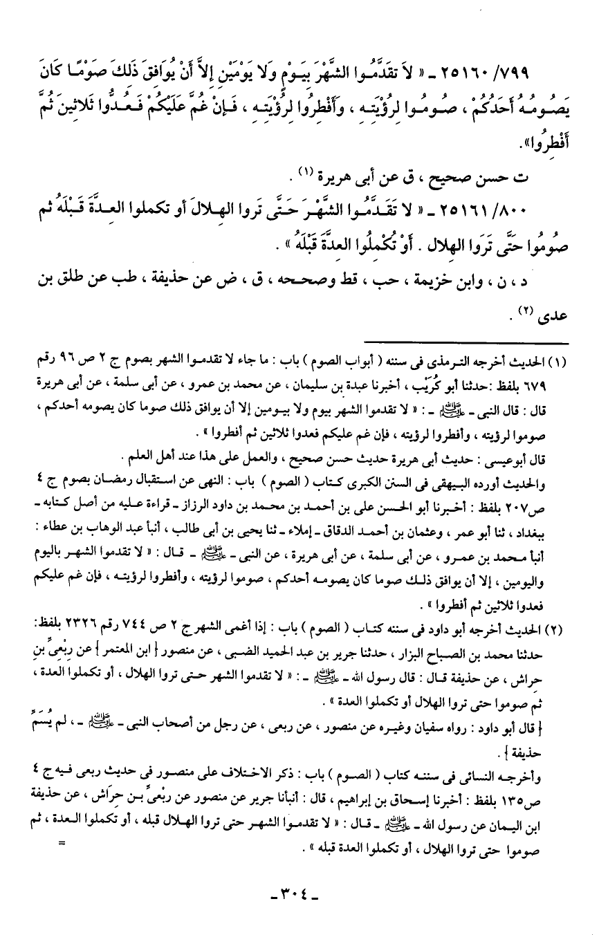 (¬2) الحديث أخرجه أبو داود في سننه كتاب (الصوم) باب: إذا أغمى الشهر ج 2 ص 744 رقم 2326 بلفظ: حدثنا محمد بن الصباح البزار، حدثنا جرير بن عبد الحميد الضبى، عن منصور [ابن المعتمر] عن رِبْعِىِّ بنِ حِراش، عن حذيفة قال: قال رسول الله - صلى الله عليه وسلم -: "لا تقدموا الشهر حتى تروا الهلال، أو تكملوا العدة، ثم صوموا حتى تروا الهلال أو تكملوا العدة".