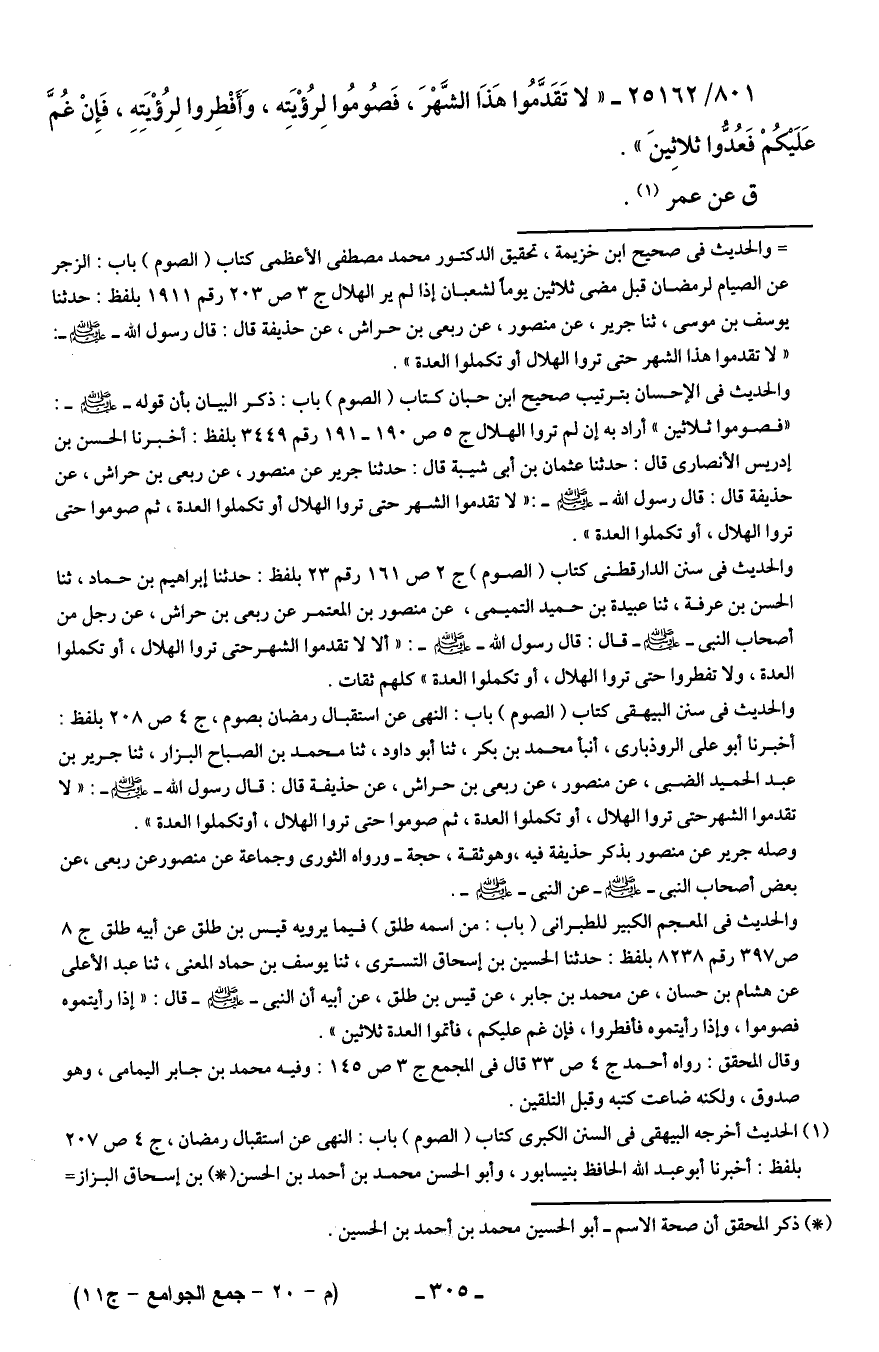 801/ 25162 - "لا تَقَدَّمُوا هَذَا الشَّهْرَ، فَصُومُوا لِرُؤْيَتِه، وَأَفْطِروا لِرُؤْيَتِه، فَإنْ غُمَّ عَلَيْكُمْ فَعُدُّوا ثلاِثينَ".