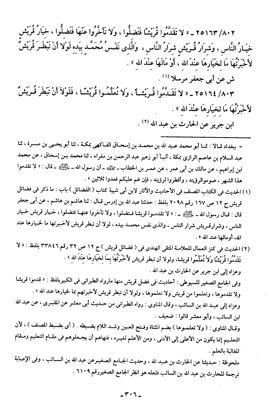 (¬2) الحديث في كنز العمال للعلامة المتقى الهندى في (فضائل قريش) ج 12 ص 32 رقم 33846 بلفظ: "لا تَقَدَّمُوا قُرَيْشًا وَلاَ تُعَلِّمُوا قريشا، ولولا أن تبطر قريش لأَخْبَرْنُهَا بِمَا لِخَيَارِهَا عِنْدَ اللهِ".