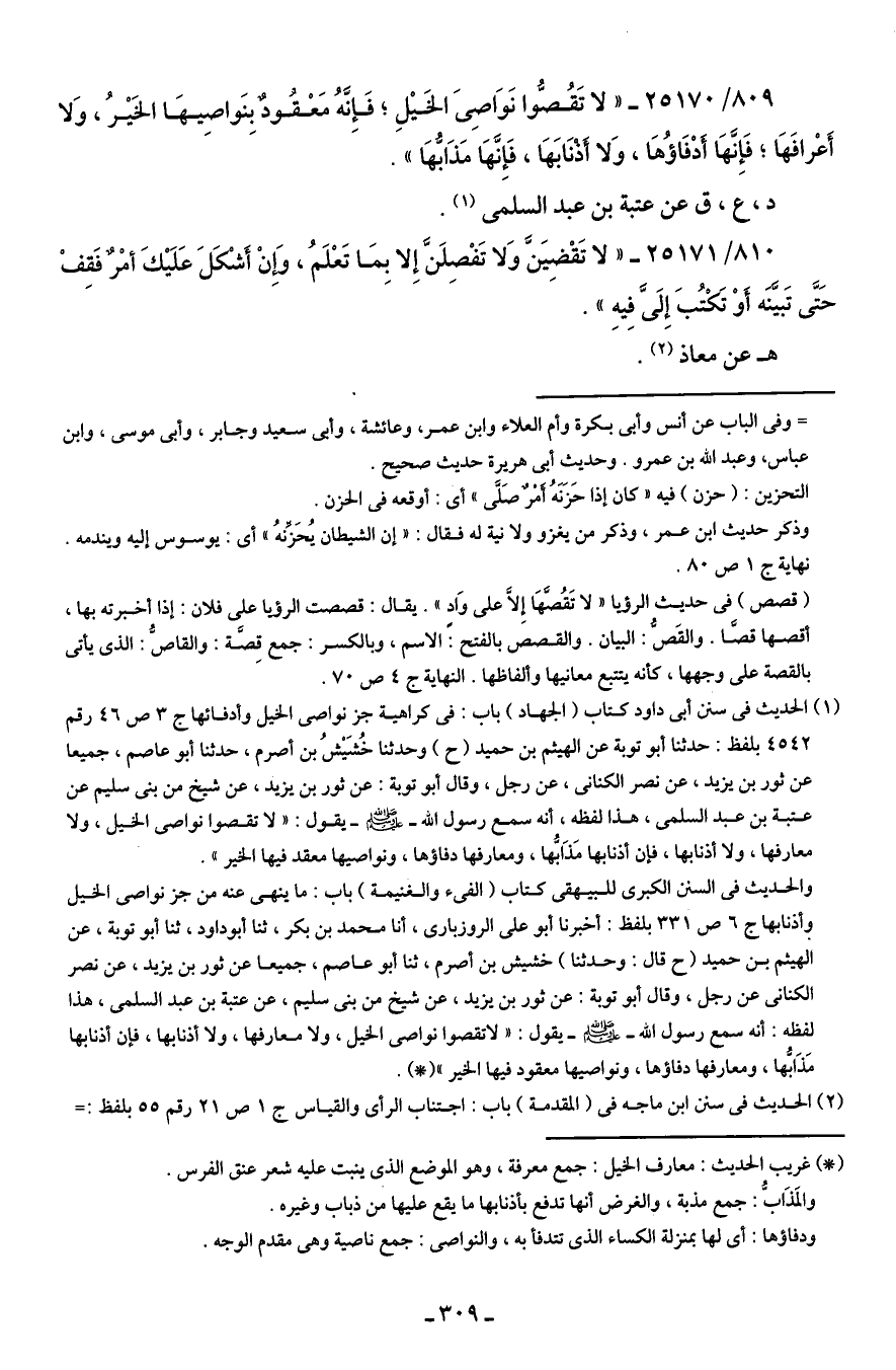 (¬1) الحديث في سنن أبى داود كتاب (الجهاد) باب: في كراهية جز نواصى الخيل وأدفائها ج 3 ص 46 رقم 4542 بلفظ: حدثنا أبو توبة عن الهيثم بن حميد (ح) وحدثنا خُشَيْشُ بن أصرم، حدثنا أبو عاصم، جميعا عن ثور بن يزيد، عن نصر الكنانى، عن رجل، وقال أبو توبة: عن ثور بن يزيد، عن شيخ من بنى سليم عن عتبة بن عبد السلمى، هذا لفظه، أنه سمع رسول الله - صلى الله عليه وسلم - يقول: "لا نقصوا نواصى الخيل، ولا معارفها، ولا أذنابها، فإن أذنابها مَذَابُّها، ومعارفها دفاؤها، ونواصيها معقد فيها الخير".