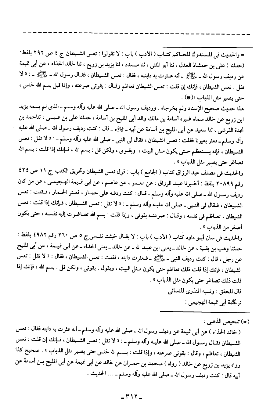 (خالد الحذاء) عن أبى تميمة عن رديف رسول الله - صلى الله عليه وآله وسلم - أنه عثرت به دابته فقال: تعس الشيطان فقال رسول الله - صلي وآله وسلم -: "لا تقل: تعس الشيطان، فإنك إن قلت: تعس الشيطان، تعاظم، وقال: بقوتى صرعته، وإذا قلت: بسم الله خنس حتى يصير مثل الذباب". صحيح كذا رواه يزيد بن زريع عن خالد (رواه) محمد بن حمران عن خالد عن أبى تميمة عن أبى المليح بن أسامة عن أبيه قال: كنت رديف رسول الله - صلى الله عليه وآله وسلم - ... الحديث.