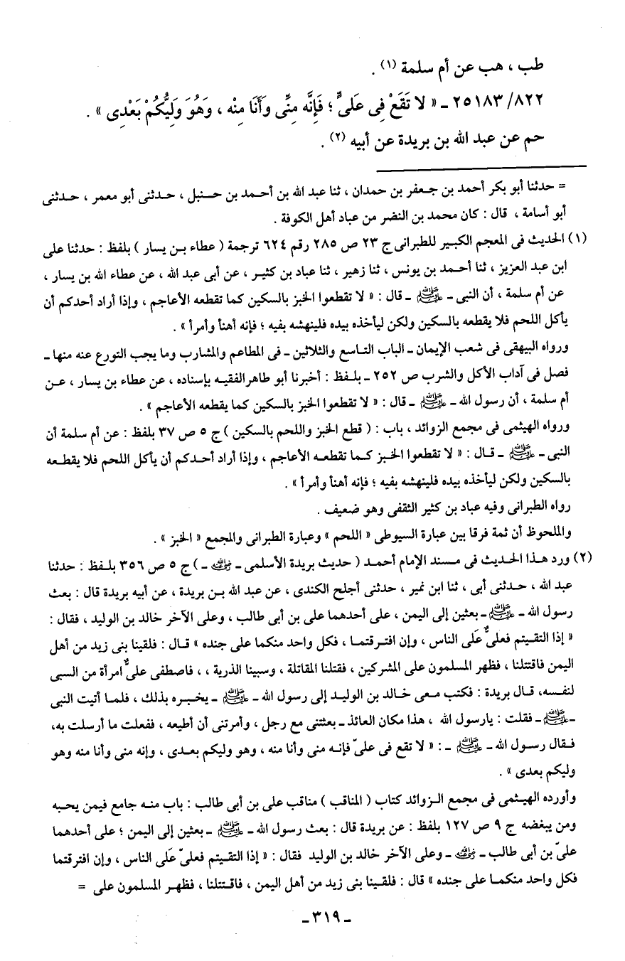 (¬2) ورد هذا الحديث في مسند الإمام أحمد (حديث بريدة الأسلمى - رضي الله عنه -) ج 5 ص 356 بلفظ: حدثنا عبد الله، حدثنى أبى، ثنا ابن نمير، حدثنى أجلح الكندى، عن عبد الله بن بريدة، عن أبيه بريدة قال: بعث رسول الله - صلى الله عليه وسلم - بعثين إلى اليمن، على أحدهما على بن أبى طالب، وعلى الآخر خالد بن الوليد، فقال: "إذا التقيتم فعلىٌّ عَلى الناس، وإن افترقتما، فكل واحد منكما على جنده" قال: فلقينا بنى زيد من أهل اليمن فاقتتلنا، فظهر المسلمون على المشركين، فقتلنا المقاتلة، وسبينا الذرية، ، فاصطفى علىٌّ امرأة من السبى لنفسه، قال بريدة: فكتب معى خالد بن الوليد إلى رسول الله - صلى الله عليه وسلم - يخبره بذلك، فلما أتيت النبي - صلى الله عليه وسلم - فقلت: يا رسول الله - صلى الله عليه وسلم -، هذا مكان العائذ - بعثتنى مع رجل، وأمرتنى أن أطيعه، ففعلت ما أرسلت به، فقال رسول الله - صلى الله عليه وسلم - "لا تقع في علىّ فإنه منى وأنا منه، وهو وليكم بعدى، وإنه منى وأنا منه وهو وليكم بعدى".