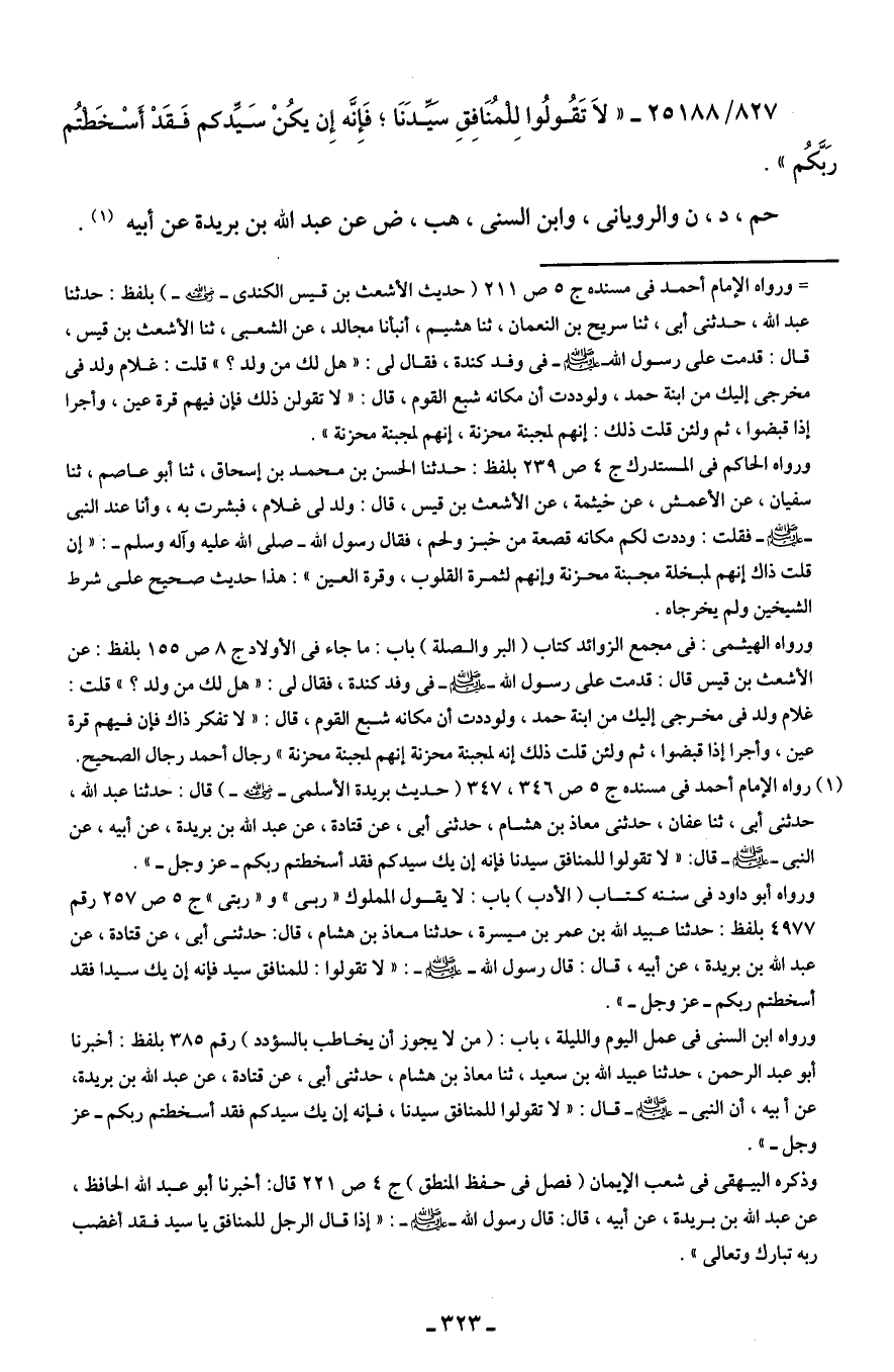 (¬1) رواه الإمام أحمد في مسنده ج 5 ص 346، 347 (حديث بريدة الأسلمى - رضي الله عنه -) قال: حدثنا عبد الله، حدثنى أبى، ثنا عفان، حدثنى معاذ بن هشام، حدثنى أبى، عن قتادة، عن عبد الله بن بريدة، عن أبيه، عن النبي - صلى الله عليه وسلم - قال: "لا تقولوا للمنافق سيدنا فإنه إن يك سيدكم فقد أسخطتم ربكم - عز وجل - ".