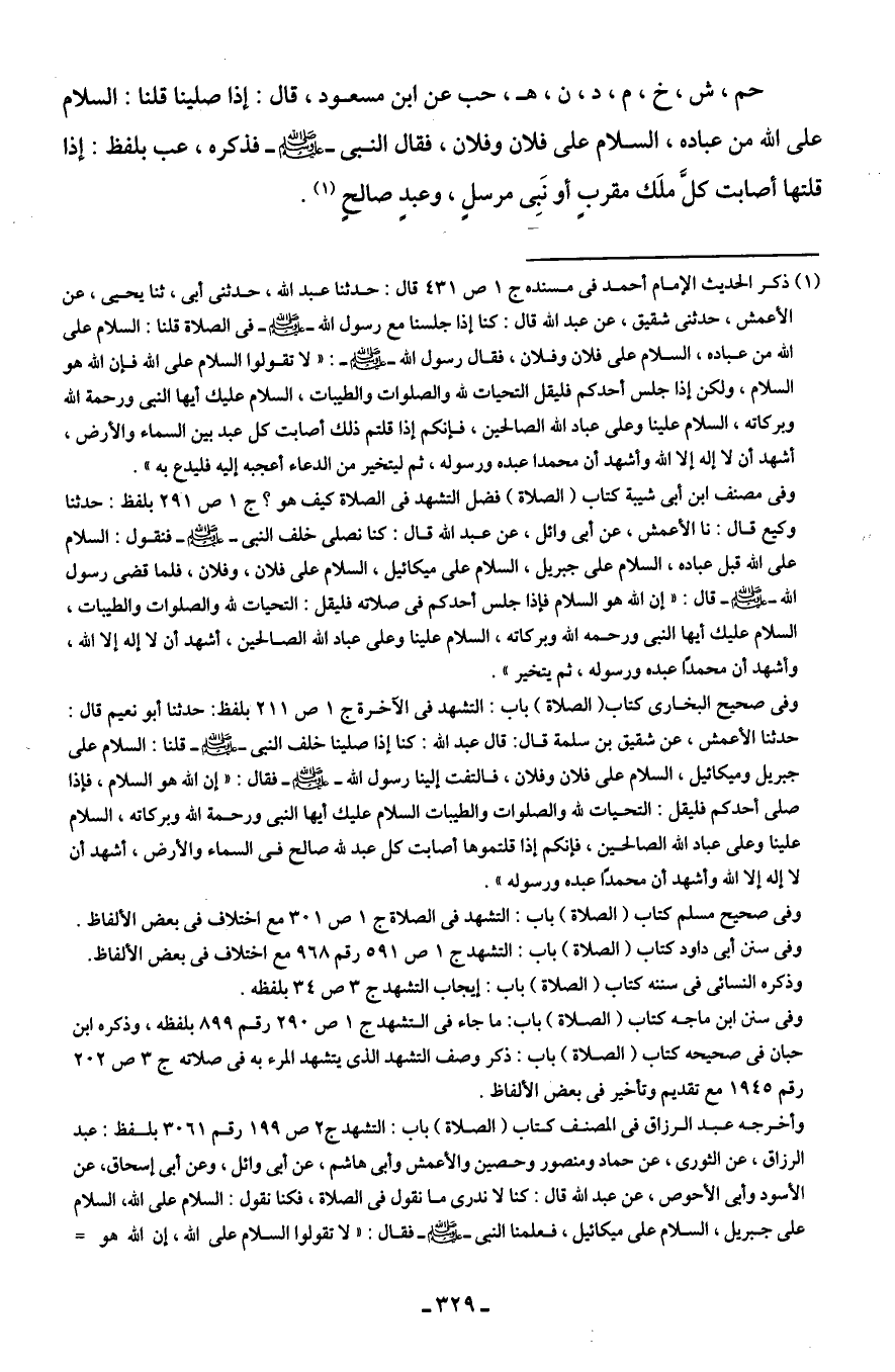 حم، ش، خ، م، د، ن، هـ، حب عن ابن مسعود، قال: إذا صلينا قلنا: السلام على الله من عباده، السلام على فلان وفلان، فقال النبي - صلى الله عليه وسلم - فذكره، عب بلفظ: إذا قلتها أصابت كلَّ ملَك مقربٍ أو نَبِى مرسلٍ، وعبدٍ صالحٍ (¬1).