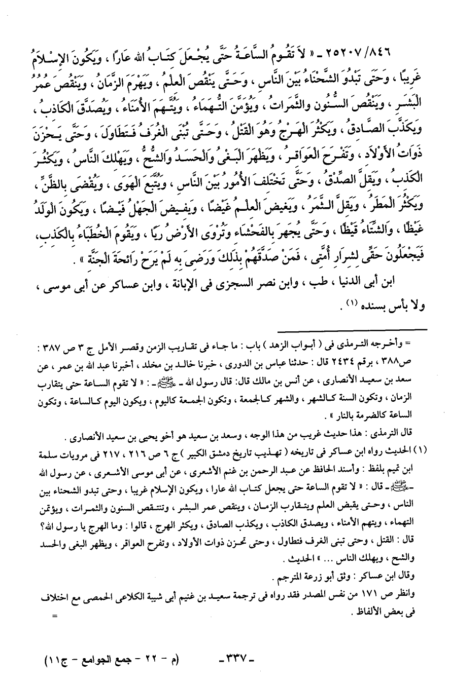 (¬1) الحديث رواه ابن عساكر في تاريخه (تهذيب تاريخ دمشق الكبير) ج 6 ص 216، 217 في مرويات سلمة ابن تميم بلفظ: وأسند الحافظ عن عبد الرحمن بن غنم الأشعرى، عن أبى موسى الأشعرى، عن رسول الله - صلى الله عليه وسلم - قال: "لا تقوم الساعة حتى يجعل كتاب الله عارا، ويكون الإسلام غريبا، وحتى تبدو الشحناء بين الناس، وحتى يقبض العلم ويتقارب الزمان، وينقص عمر البشر، وتنتقص السنون والثمرات، ويؤتمن التهماء، ويتهم الأمناء، ويصدق الكاذب، ويكذب الصادق، ويكثر الهرج، قالوا: وما الهرج يا رسول الله - صلى الله عليه وسلم -؟ قال: القتل، وحتى تبنى الغرف فتطاول، وحتى تحزن ذوات الأولاد، وتفرح العواقر، ويظهر البغى والحسد والشح، ويهلك الناس ... " الحديث.