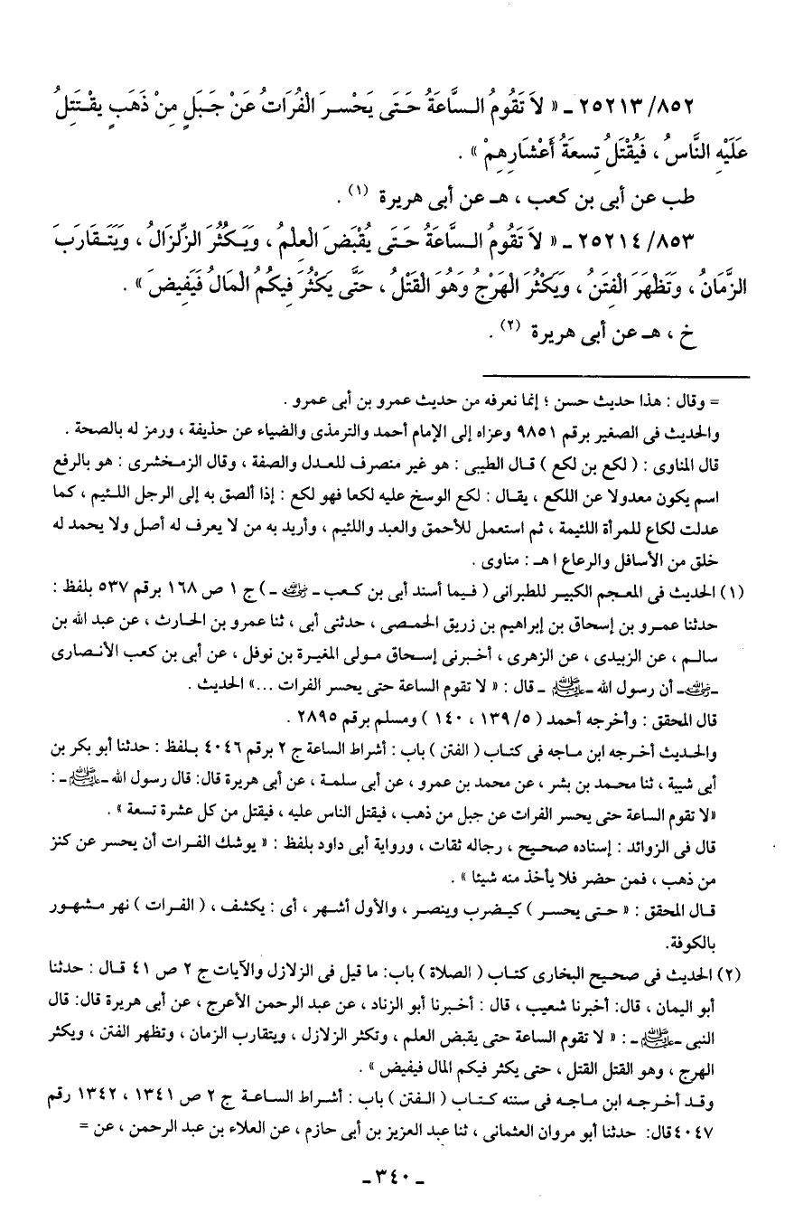 852/ 25213 - "لاَ تَقُومُ السَّاعَةُ حَتَّى يَحْسرَ الْفرَاتُ عَنْ جَبَلٍ مِنْ ذَهَبٍ يقْتَتِلُ عَلَيْهِ النَّاسُ، فَيُقْتَلُ تِسعَةُ أعْشَارِهِمْ".