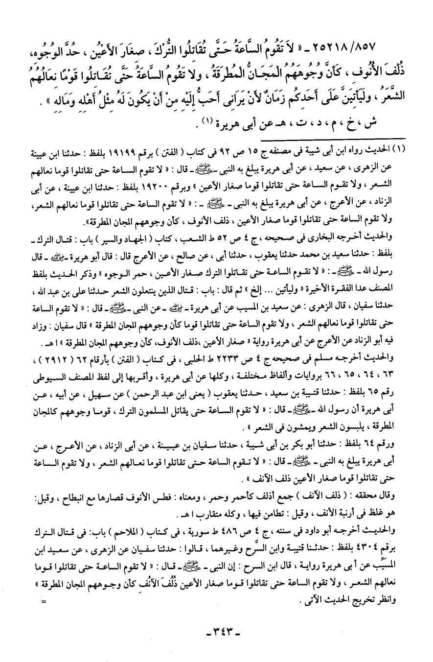 857/ 25218 - "لاَ تَقُومُ السَّاعَةُ حَتَّى تُقَاتِلُوا التُّرْكَ، صِغَارَ الأعْيُن، حُدَّ الوُجُوهِ، ذُلْفَ الأُنُوفِ، كَأنَّ وجُوهَهُمُ الْمَجَانُّ الْمُطرَقَةُ، ولا تَقُومُ السَّاعَةُ حَتَّى تُقَاتِلُوا قَوْمًا نِعَالُهُمُ الشَّعَرُ، ولَيَأتِيَنَّ عَلَى أَحَدِكُم زَمَانٌ لأنْ يَرَانِى أَحَبُّ إِلَيْه مِنْ أَنْ يَكُونَ لَهُ مثْلُ أَهْله وَمَالهِ".