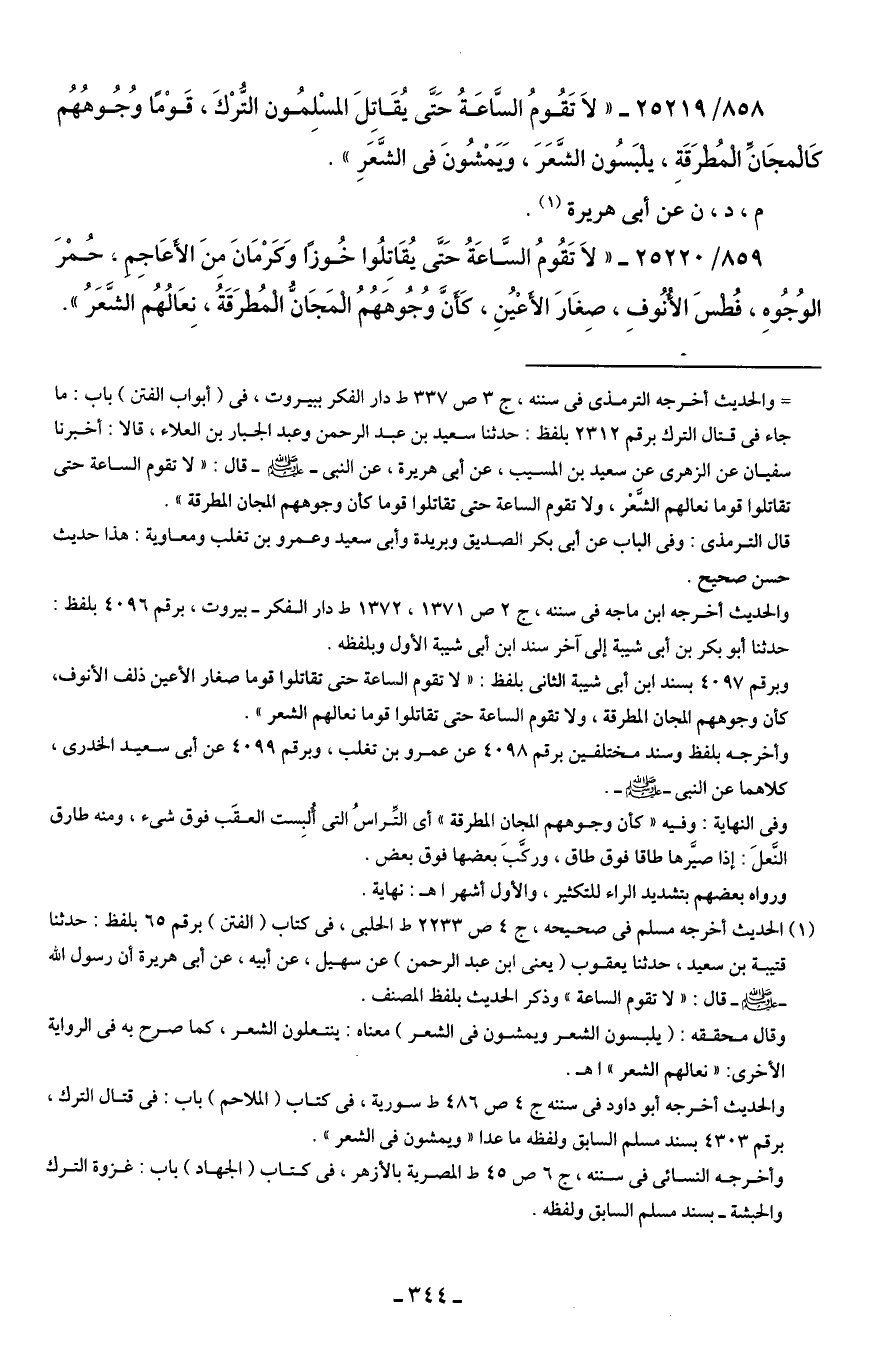 858/ 25219 - "لاَ تَقُوم السَّاعَةُ حَتَّى يُقَاتِلَ المسْلِمُون التُّرْكَ، قَوْمًا وُجُوهُهُم كَالْمجَانِّ الْمُطرَقَةِ، يلبَسُون الشَّعَرَ، وَيَمْشُونَ في الشَّعَرِ".