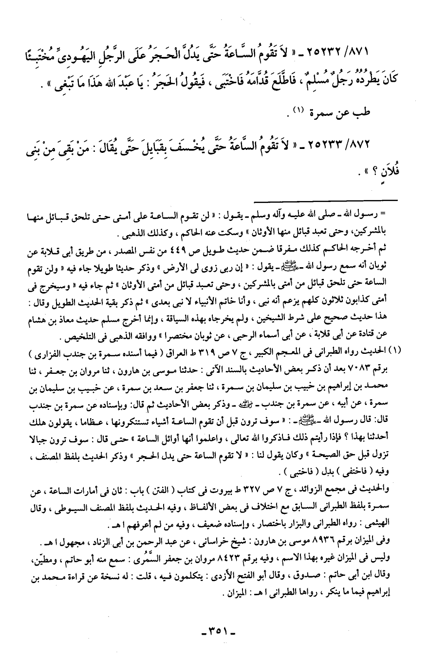 872/ 25233 - "لاَ تَقُومُ السَّاعَةُ حَتَّى يُخْسَفَ بِقَبَايِلَ حَتَّى يُقَالَ: مَنْ بَقِىَ مِنْ بَنِى فُلاَنٍ؟ ".