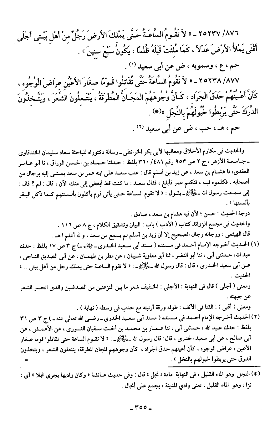 (¬2) الحديث أخرجه الإِمام أحمد في مسنده (مسند أبى سعيد الخدرى - رضي الله تعالى عنه -) ج 3 ص 31 بلفظ: حدثنا عبد الله، حدثنى أبى، ثنا عمار بن محمَّد بن أخت سفيان الثورى، عن الأعمش، عن أبى صالح، عن أبى سعيد الخدرى، قال: قال رسول الله - صلى الله عليه وسلم -: "لا تقوم الساعة حتى تقاتلوا قوما صغار الأعين، عراض الوجوه، كأن أعينهم حدق الجراد، كأن وجوههم المجان المطرقة، ينتعلون الشعر، ويتخذون الدرق حتى يربطوا خيولهم بالنخل". =