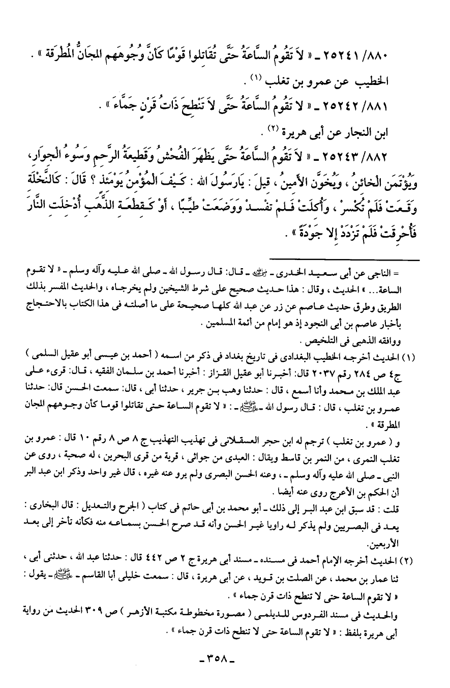 880/ 25241 - "لاَ تَقُومُ السَّاعَةُ حَتَّى تُقَاتِلوا قَوْمًا كَأنَّ وُجُوهَهم المجَانُّ المُطرَقة".