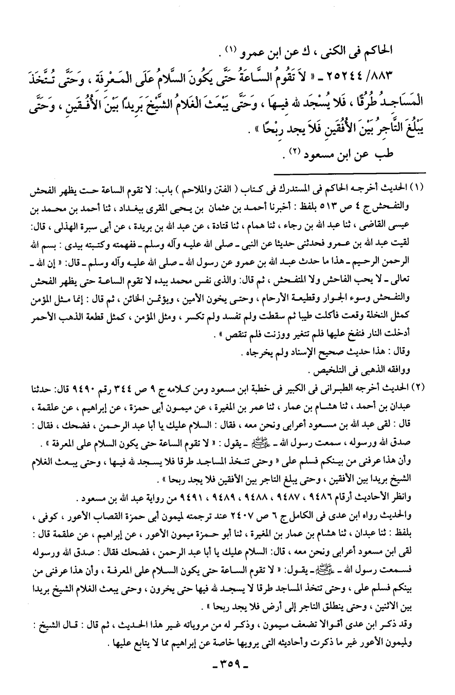 883/ 25244 - "لاَ تَقُومُ السَّاعَةُ حَتَّى يَكُونَ السَّلامُ عَلَى الْمَعْرِفَةِ، وَحَتَّى تُتَّخَذَ الْمَسَاجدُ طُرُقًا، فَلا يُسْجَد لله فِيهَا، وَحَتَّى يَبْعَثَ الْغَلامُ الشَّيْخَ بَرِيدًا بَيْنَ الأُفُقَينِ، وَحَتَّى يَبْلُغَ التَّاجِرُ بَيْنَ الأفُقَينِ فَلاَ يجد رِبْحًا".