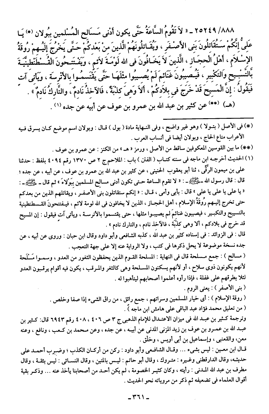 888/ 25249 - "لاَ تَقُومُ السَّاعَةُ حَتَّى يكون أَدْنى مَسَالِح الْمُسْلِمين بِبُولان (*) يَا عَلِىُّ إنَّكُمْ سَتُقَاتلُونَ بَنى الأصْفَرِ، وَيُقَاتِلُونَهُمْ الّذِينَ مِنْ بَعْدِكُمْ حَتَّى يَخْرُجَ إِلَيُهِمْ رُوقَةُ الإِسلاَمِ، أهْلُ الْحِجَازِ، الَّذِينَ لاَ يَخَافُونَ في الله لَوْمَةَ لاَئِمٍ، وَيَفتَتِحُونَ الْقُسْطَنْطِينَّيةَ بَّالتَّسْبِيح وَالتَّكْبيرِ، فَيُصِيبُونَ غَنَائِمَ لَمْ يُصيبُوا مِثْلَهَا حَتَّى يَقْتَسِمُوا بِالأتْرِسَة، وَيَأتى آتٍ فَيَقُولُ: إِنَّ الْمَسِيحَ قَدْ خَرَجَ في بِلاَدِكُمْ، ألَاَ وَهِىَ كِذْبَةٌ، فَالآخِذُ نَادِمٌ، والتَّارِكُ نَادِمٌ".