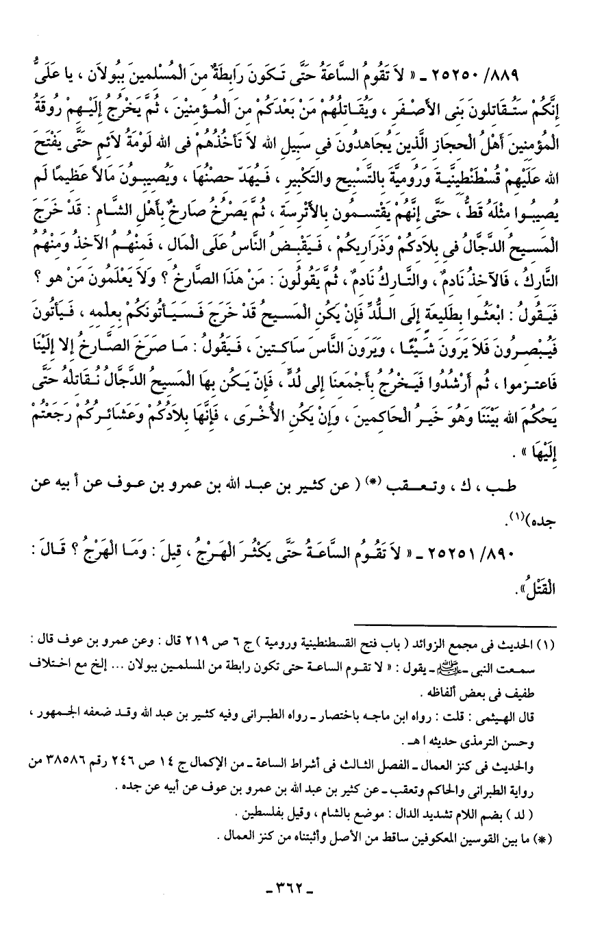 889/ 25250 - "لاَ تَقُومُ السَّاعَةُ حَتَّى تَكَونَ رَابِطَةٌ مِنَ الْمُسْلِمينَ بِبُولاَن، يا عَلَىُّ إِنَّكُمْ سَتُقَاتِلونَ بَنِى الأَصْفَرِ، وَيُقَاتِلُهُمْ مَنْ بَعْدَكُمْ مِنَ الْمُؤمِنيْنَ، ثُمَّ يَخْرُجُ إِلَيْهِمْ رُوقَةُ الْمُؤمِنِينَ أَهْلُ الْحِجَازِ الَّذِينَ يُجَاهِدُونَ في سَبِيلِ الله لاَ تَأخُذُهُمْ في الله لَوْمَةُ لاَئِمٍ حَتَّى يَفْتَحَ الله عَلَيْهِمْ قُسْطَنْطِيِنَّيةَ وَرُومِيَّةَ بِالتَّسْبِيح والتَكْبِيرِ، فَيُهَدّ حِصْنُهَا، وَيُصيبِوُنَ مَالًا عًظِيمًا لَم يُصيبُوا مِثْلَهُ قَطُّ، حَتَّى إِنَّهُمْ يَقْتِسمُون بِالأَتْرِسَةِ، ثُمَّ يَصْرُخُ صَارخٌ بِأهلِ الشَّامِ: قَدْ خَرَجَ الْمَسِيحُ الدجَّالُ في بِلاَدِكُمْ وَذَرَارِيكُمْ، فَيَقْبِضُ النَّاسُ عَلَى الْمَالِ، فَمِنْهُمُ الآخِذُ وَمِنْهُم التَّارِكُ، فَالآخِذُ نَادِمٌ، والتَّارِكُ نَادِمٌ، ثُمَّ يَقُولُونَ: مَنْ هَذَا الصَّارخُ؟ وَلاَ يَعْلَمُونَ مَنْ هو؟ فَيَقُولُ: ابْعَثُوا بِطَلِيعَةٍ إِلَى اللُّدِّ فَإِنْ يَكُنِ الْمَسيحُ قَدْ خَرَجَ فَسَيَأتُونَكُمْ بِعلمِهِ، فَيَأتُونَ فَيُبْصِرُونَ فَلاَ يَرَونَ شَيْئًا، وَيَرَونَ النَّاسَ سَاكِتينَ، فَيَقُولُ: مَا صَرَخَ الصَّارخُ إِلا إِلَيْنَا فَاعتزموا، ثُم أرْشُدُوا فَيَخْرُجُ بِأَجْمَعِنَا إِلى لُدٍّ، فَإِنّ يَكُن بِهَا الْمَسِيحُ الدَّجَّالُ نُقَاتلهُ حَتَّى يَحكمَ الله بَيْنَنَا وَهُوَ خَيرُ الْحَاكمينَ، وَإنْ يَكُنِ الأُخْرَى، فَإِنَّهَا بِلاَدُكُمْ وَعَشَائِرُكُمْ رَجَعْتُمْ إِلَيْهَا".