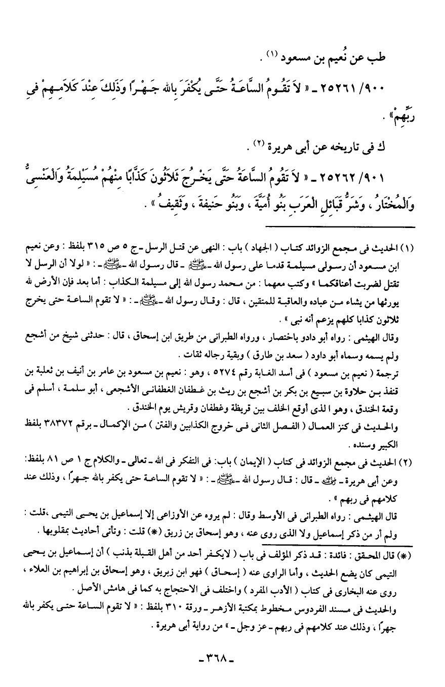 (¬2) الحديث في مجمع الزوائد في كتاب (الإيمان) باب: في التفكر في الله - تعالى - والكلام ج 1 ص 81 بلفظ: وعن أبي هريرة - رضي الله عنه - قال: قال رسول الله - صلى الله عليه وسلم -: "لا تقوم الساعة حتَّى يكفر بالله جهرًا، وذلك عند كلامهم في ربهم".