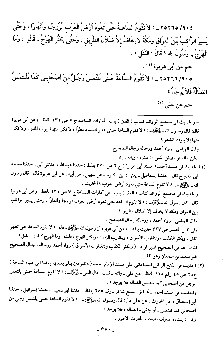 (¬2) الحديث في الفتح الربانى للساعاتى على مسند الإمام أحمد (ذكر فتن يتلو بعضها بعضًا إلى قيام الساعة) ج 24 ص 45 رقم 125 بلفظ: عن عليٍّ - رضي الله عنه - قال: قال النَّبيّ - صلى الله عليه وسلم -: "لا تقوم الساعة حتَّى يلتمس الرجل من أصحابى كما تلتمس الضَّالة فلا يوجد".