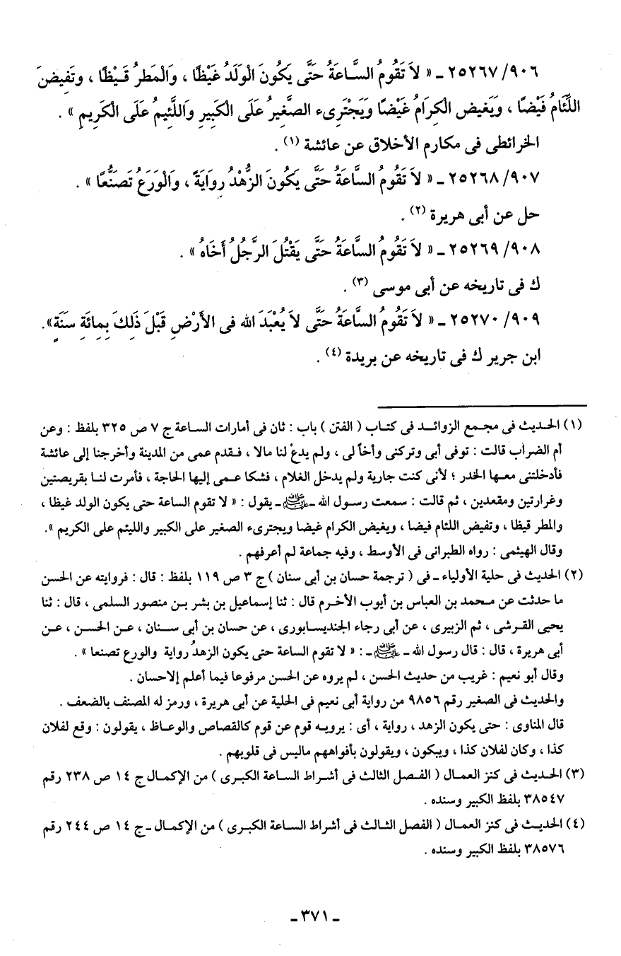 906/ 25267 - "لاَ تَقُومُ السَّاعَةُ حَتَّى يَكُونَ الوَلَدُ غَيْظًا، وَالمَطرُ قَيْظًا، وتَفِيضنَ اللِّئَامُ فَيْضًا، وَيَغيض الكِرَامُ غَيْضًا وَيَجْتَرِئ الصَّغِيرُ عَلَى الكبِيرِ وَاللَّئِيمُ عَلَى الكَرِيم".