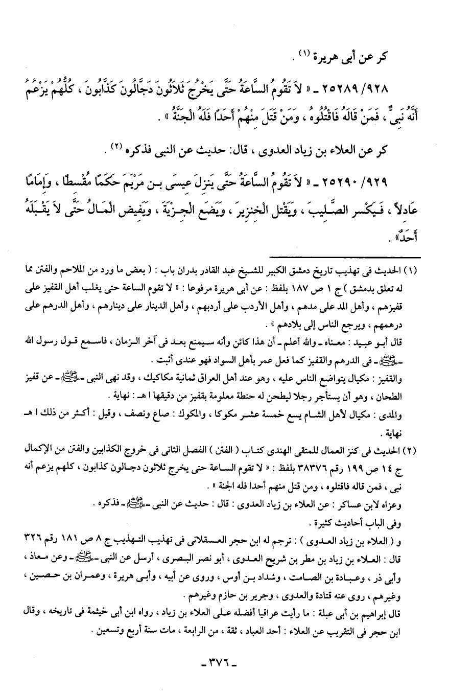 (¬1) الحديث في تهذيب تاريخ دمشق الكبير للشَّيخ عبد القادر بدران باب: (بعض ما ورد من الملاحم والفتن مما له تعلق بدمشق) ج 1 ص 187 بلفظ: عن أبي هريرة مرفوعًا: "لا تقوم الساعة حتَّى يغلب أهل القفيز على قفيزهم، وأهل المد على مدهم، وأهل الأردب على أردبهم، وأهل الدينار على دينارهم، وأهل الدرهم على درهمهم، ويرجع النَّاس إلى بلادهم".