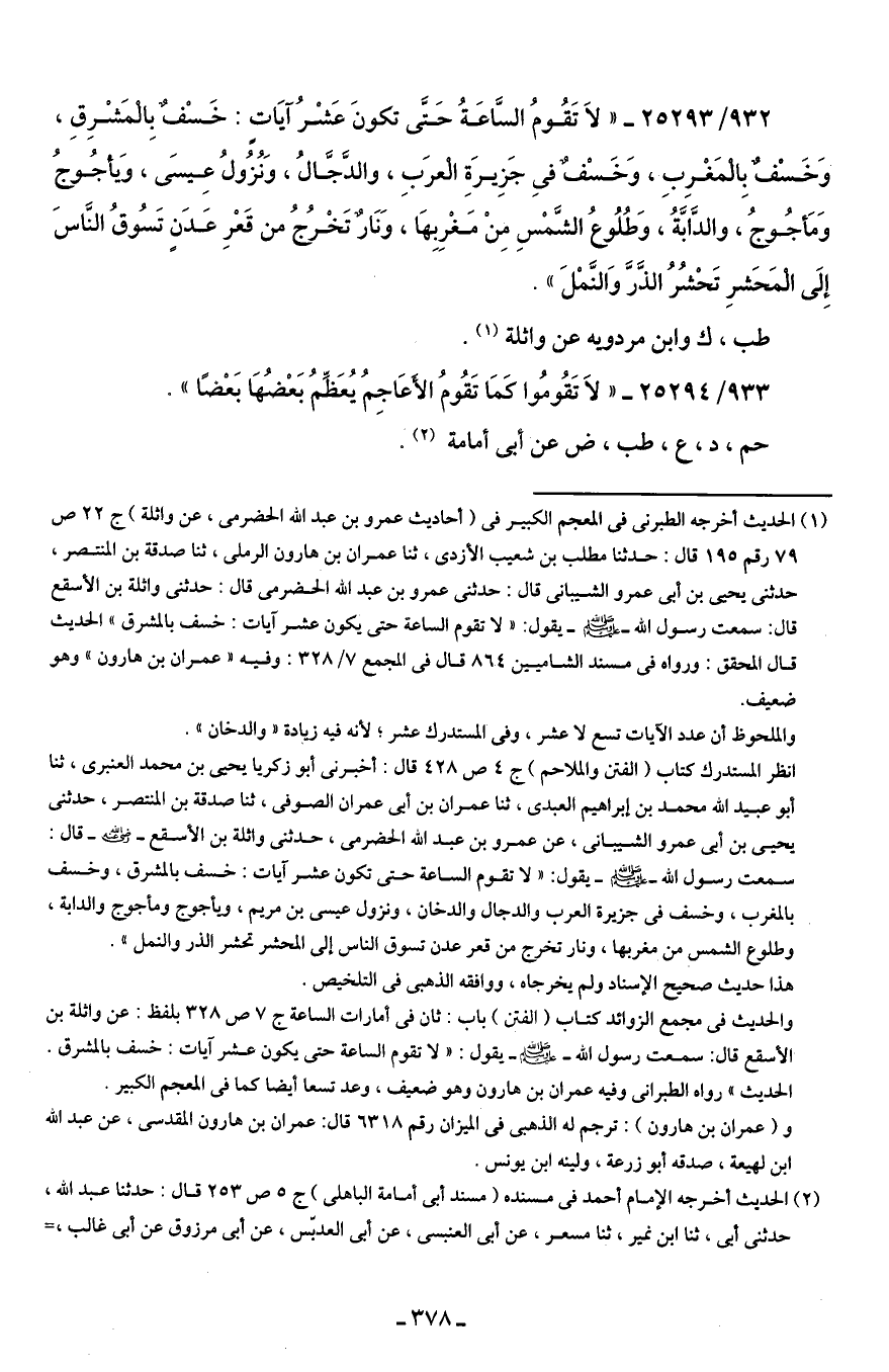 932/ 25293 - "لاَ تَقُومُ السَّاعَةُ حَتَّى تكونَ عَشْرُ آيَاتٍ: خَسْفٌ بِالمَشْرقِ، وَخَسْفٌ بِالمَغْرِبِ، وَخَسْفٌ في جَزِيرَةِ العرَب، والدَّجَّالُ، وَنُزُولُ عِيسَى، وَيأجُوجُ وَمَأجُوجُ، والدَّابَّةُ، وَطُلُوعُ الشَّمْسِ مِنْ مَغْرِبِهَا، وَنَارٌ تَخْرجٌ من قَعْرِ عَدَنٍ تَسُوقُ النَّاسَ إِلَى المَحَشرِ تَحْشُرُ الذَّرَّ وَالنَّمْلَ".